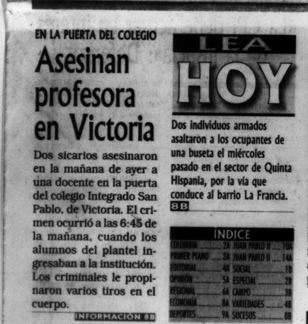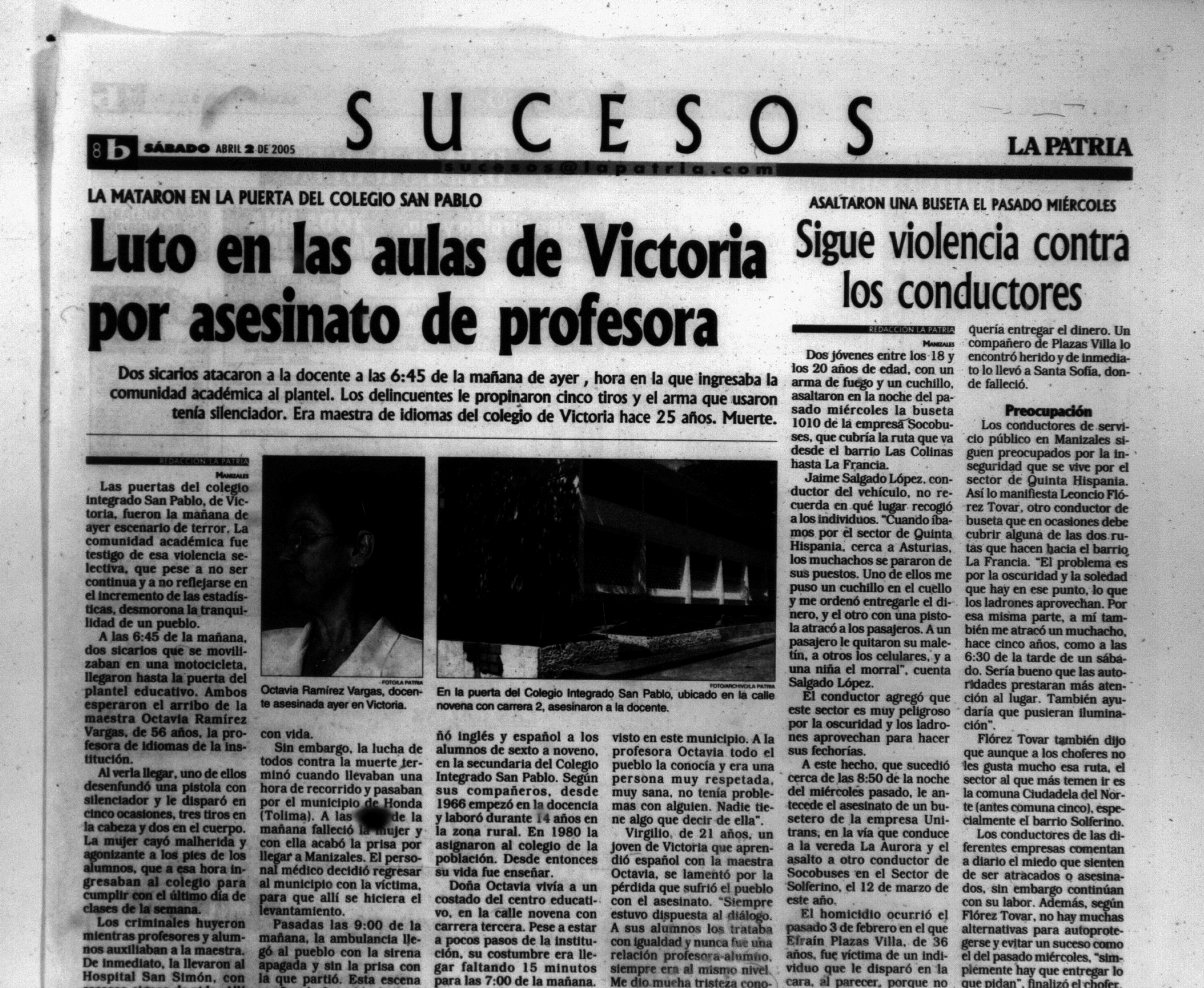 Catorce años atrás, el 1 de abril de 2005, Octavia Ramírez Vargas, profesora del entonces Colegio Integrado San Pablo de Victoria Caldas, caía herida de muerte en la puerta de la institución. Sobre las 6:45 a.m., justo cuando Octavia llegaba para empezar la jornada, un hombre se le acercó, la llamó por su nombre y le disparó varias veces. Una de las balas se incrustó en su frente.