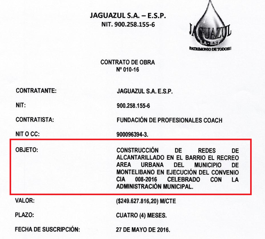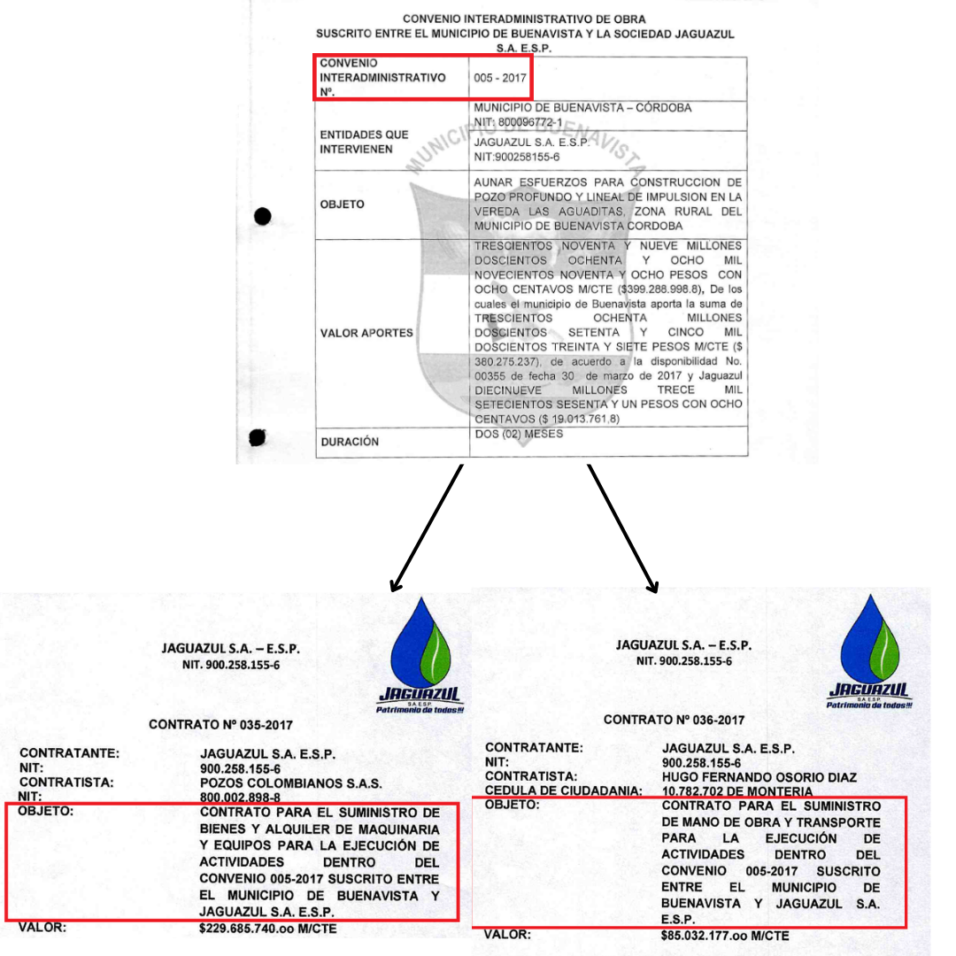 Cuestión Pública encontró que los contratos firmados entre Jaguazul y las dos empresas hacían parte de los convenios, encargados de la reposición de redes de acueducto y la construcción de redes de alcantarillado. En los contratos, las dos empresas se encargaban de ejecutar la obra, suministrar los bienes y materiales; y de alquilar la maquinaria, los equipos y el transporte.