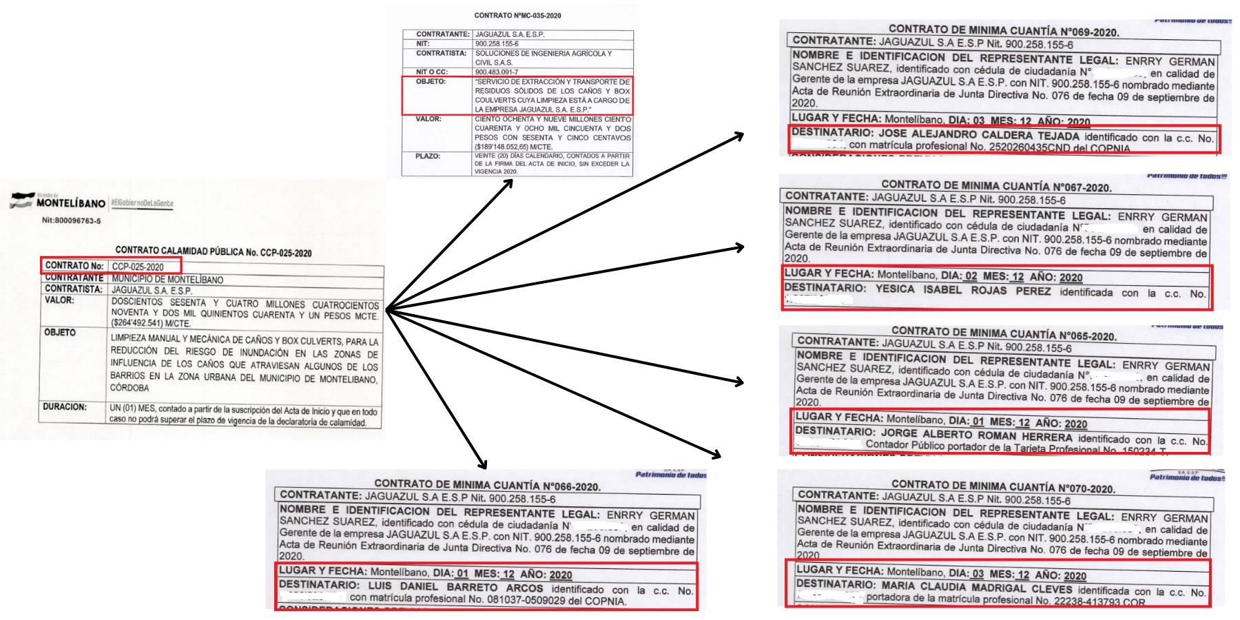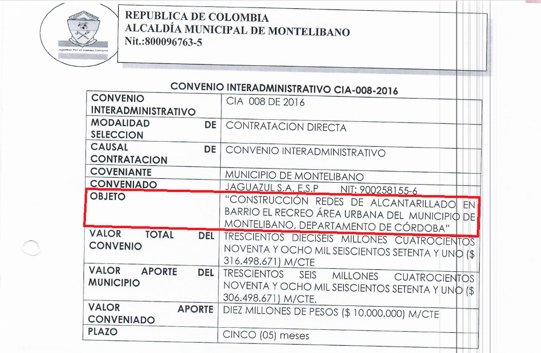 Esta alianza encontró presuntas irregularidades en 25 convenios interadministrativos celebrados por las alcaldías de Buenavista, San José de Uré y Montelíbano, con la empresa mixta Jaguazul, sociedad encargada del acueducto y alcantarillado de este último municipio, cuya Alcaldía tiene el 80% de las acciones. A través de estos convenios, que suman en total $19.163 millones, estos municipios adjudicaron contratos de obra y prestación de servicios a Jaguazul de manera directa y sin procesos licitatorios. A su vez, Jaguazul contrató 60 veces a terceros para desarrollar las mismas actividades por un 15% más barato.