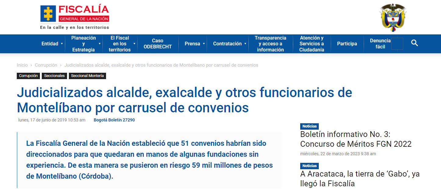 Este último contrato, por ejemplo, se celebró por $220 millones. Un año después de su ejecución, la comunidad de Montelíbano denunció el deterioro de la Villa Olímpica y los parques Santa Cruz y Bernardo Ospina —incluidos en el convenio— por fugas de agua, y el deterioro de los juegos y zonas de ejercicio, según reportó el medio local Zoom.