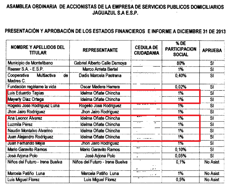 Para entender cómo este grupo maneja la contratación pública, primero es necesario saber que a la Alcaldía de Montelíbano vienen subordinadas al menos otras dos entidades: la E.S.E. Hospital Local y Jaguazul S.A. E.S.P., la encargada del acueducto y el alcantarillado. Esta última fue constituida en 2008 por el alcalde Edinson Rangel Aguas, primo de Carmen Aguas, la esposa del patriarca Calle.