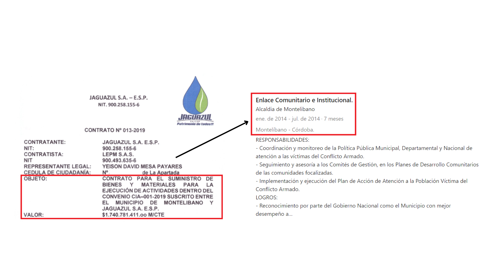 Aunque Calle Barrios y Jiménez Vanegas nunca estuvieron al mismo tiempo en LEPM, juntos tenían negocios por lo menos desde julio de 2018. Ese mes la Alcaldía de Montelíbano contrató la construcción de pavimento hidráulico en la zona urbana del municipio por $6.664 millones, el quinto contrato de mayor cuantía desde 2016. La obra fue adjudicada al Consorcio Vial Pavimento Montelíbano 2018, representado por José Calle y tenía entre sus miembros a la empresa GM2 Inversiones SAS (como dijimos antes, representada legalmente por Jiménez). Para ese momento, Calle Barrios no llevaba ni seis meses de graduado como ingeniero mecánico.