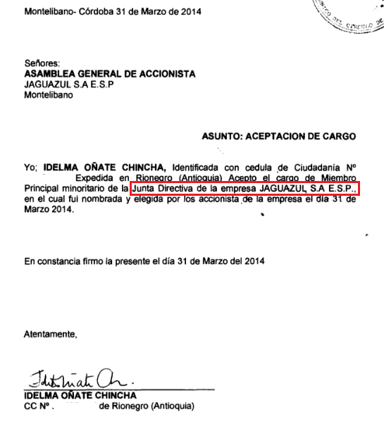 Ese 31 de diciembre de 2013, el entonces alcalde Gabriel Calle Demoya la nombró representante de los socios minoritarios. En 2016, Oñate fue miembro de la junta directiva que nombró a Jaime Ruiz Calle como gerente de Jaguazul. Para 2020 ella tenía el mayor porcentaje de acciones en la sociedad, después de la alcaldía de Montelíbano, con el 4 %. Calle señaló que ella adquirió las acciones tras la muerte de su esposo John Jairo Rodríguez.