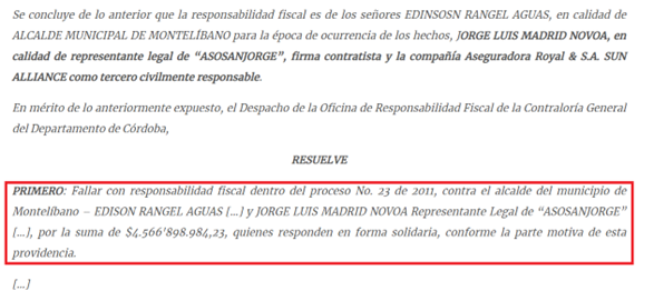 Además, Rangel fue investigado por un convenio interadministrativo celebrado con la misma asociación de municipios para la construcción de la Central de Abastos del San Jorge y el Centro Micro Empresarial de Montelíbano. Sin embargo, este proceso le valió un fallo de responsabilidad fiscal por $4.566 millones por no ejecutar la totalidad de dichas obras. Tanto él como el gerente de Asosanjorge fueron sancionados por la Sala de la Sección Primera del Consejo de Estado.