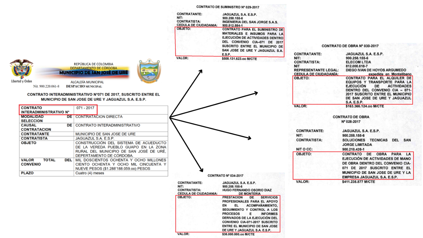 Así ocurrió con las alcaldías de San José de Uré y Buenavista. Ambos procesos sumaron $2.013 millones y luego fueron tercerizados por Jaguazul en seis ocasiones para prestar servicios de acueducto y alcantarillado. El convenio de San José de Uré fue tercerizado cuatro veces, a través de Ingeniería del San Jorge SAS, Elecom Ltda, Soluciones técnicas del San Jorge Ltda y Hugo Fernando Osorio Díaz. Este último también recibió un subcontrato en el convenio con Buenavista, al igual que Pozos colombianos SAS. Los subcontratos sumaron en total $1.433 millones; es decir, hubo una diferencia de al menos $579 millones, en comparación con el valor inicial de los convenios.