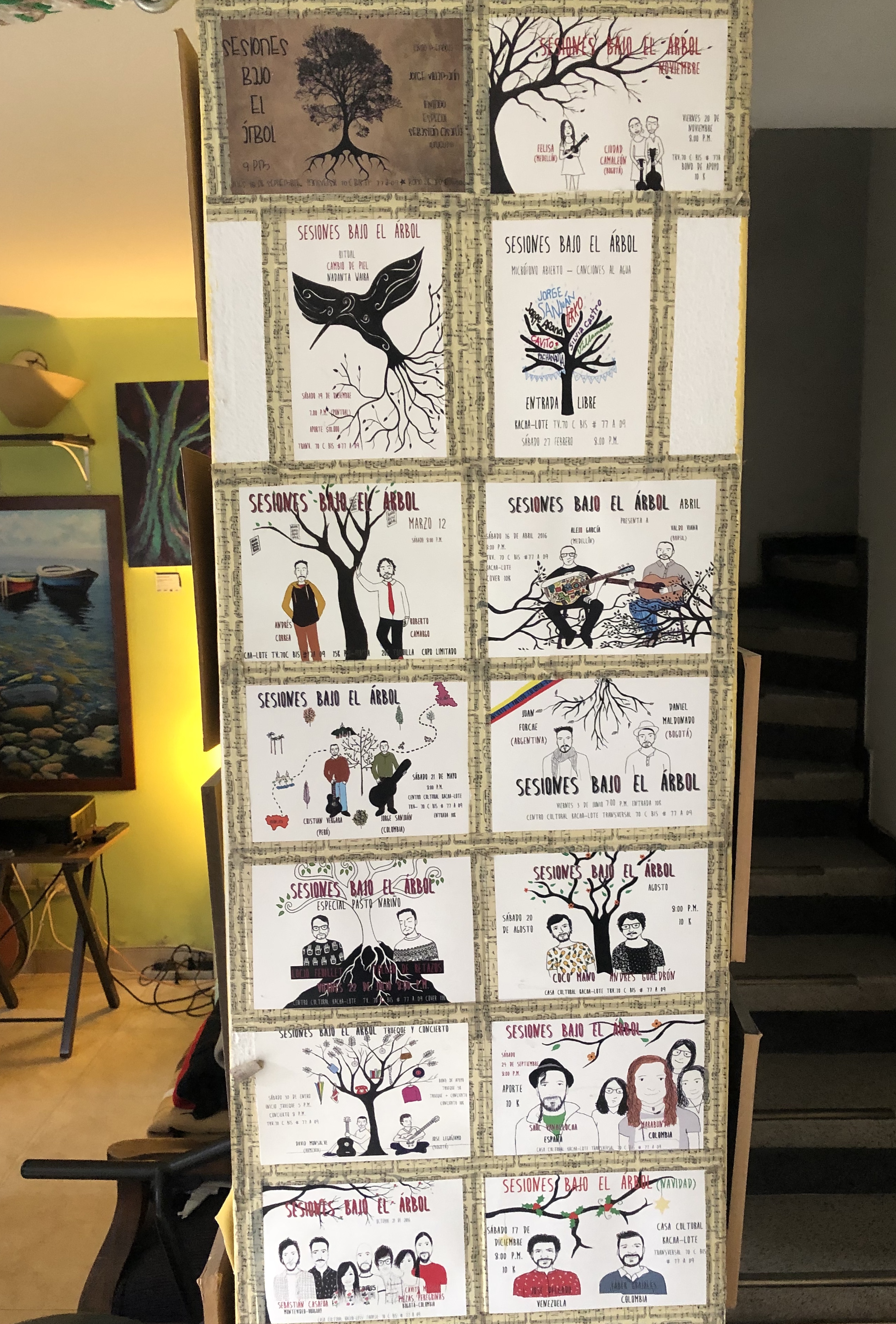 Muchas de estas obras o decoraciones, como el árbol que está pintado en la sala, son hechos por Cavito Mendoza, una de las fundadoras de Sesiones Bajo el Árbol y actual gestora. Es ella quien acude a sus dotes y sus manos inquietas para rehacer o modificar el espacio. Lleva el pincel a las paredes y traza líneas que después se convierten en objetos con significados, como lo son algunos cuadros que están colgados en las paredes o la pintura en negro que retrata los brazos de guitarras y bajos.