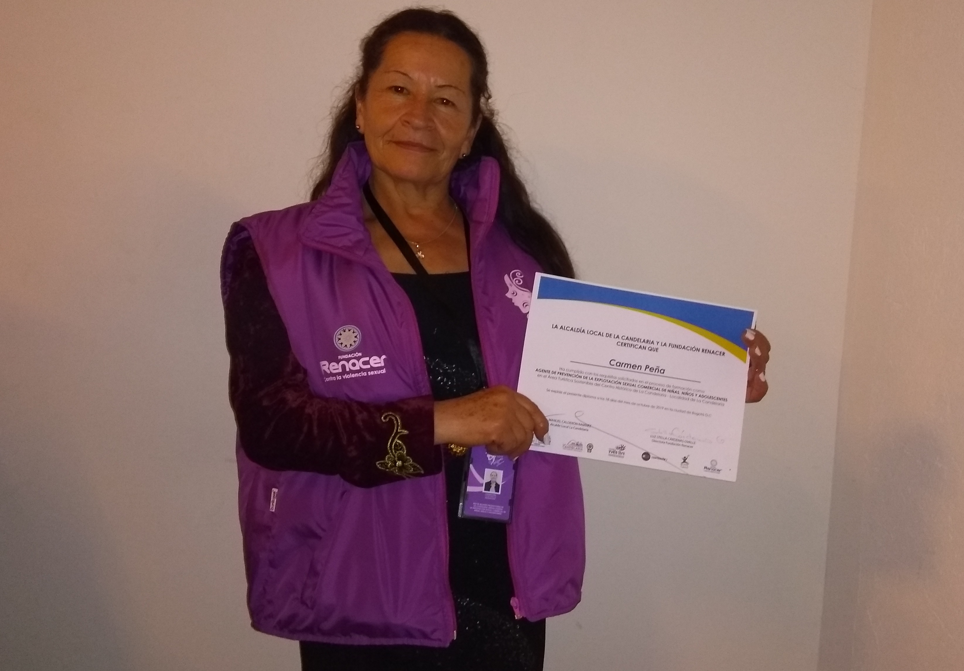 Carmen Peña es una mujer de 68 años de edad. Tiene la fuerza, la voluntad y las ganas de salir adelante, a pesar de los golpes que ha recibido en la vida. Su pasado no ha sido fácil, todo lo que ha vivido le ha servido para asumir con mayor responsabilidad su proceso de formación en dignificación. Realizó un curso de Infancia y Adolescencia, es brigadista de la Cruz Roja Colombiana y se ha convertido en una lideresa y defensora de los derechos de la mujer en su localidad.