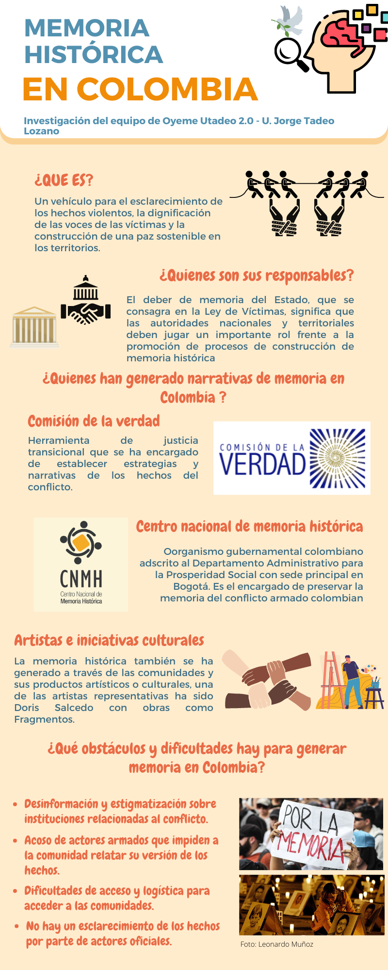 Esta producción e investigación sonora sobre el valor y los retos que tiene la generación de memoria histórica en Colombia, fue producida por estudiantes de Comunicación Social y Periodismo de la Universidad Jorge Tadeo Lozano para su programa "Radar Musical", una de las franjas  de la emisora Óyeme Utadeo 2.0. Este relato se centra en las comunidades para las que ha sido mucho más difícil generar relatos comunes de memoria: Los migrantes, las comunidades indígenas e incluso los mismos investigadores.