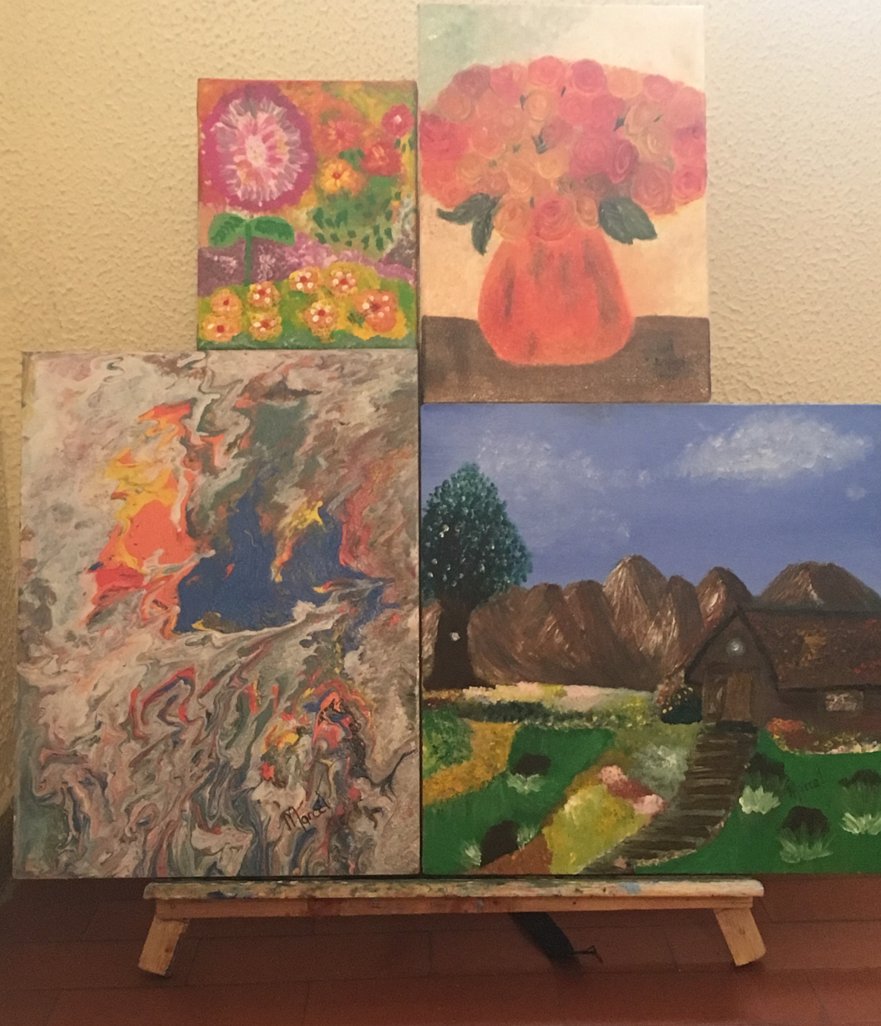 Pinturas hechas por Marcela: Estas son pinturas hechas por Marcela con todo el agrado y empeño, aquí se observa cómo ella ha logrado dominar a plenitud su mano no dominante. (Foto: Martín Romero)