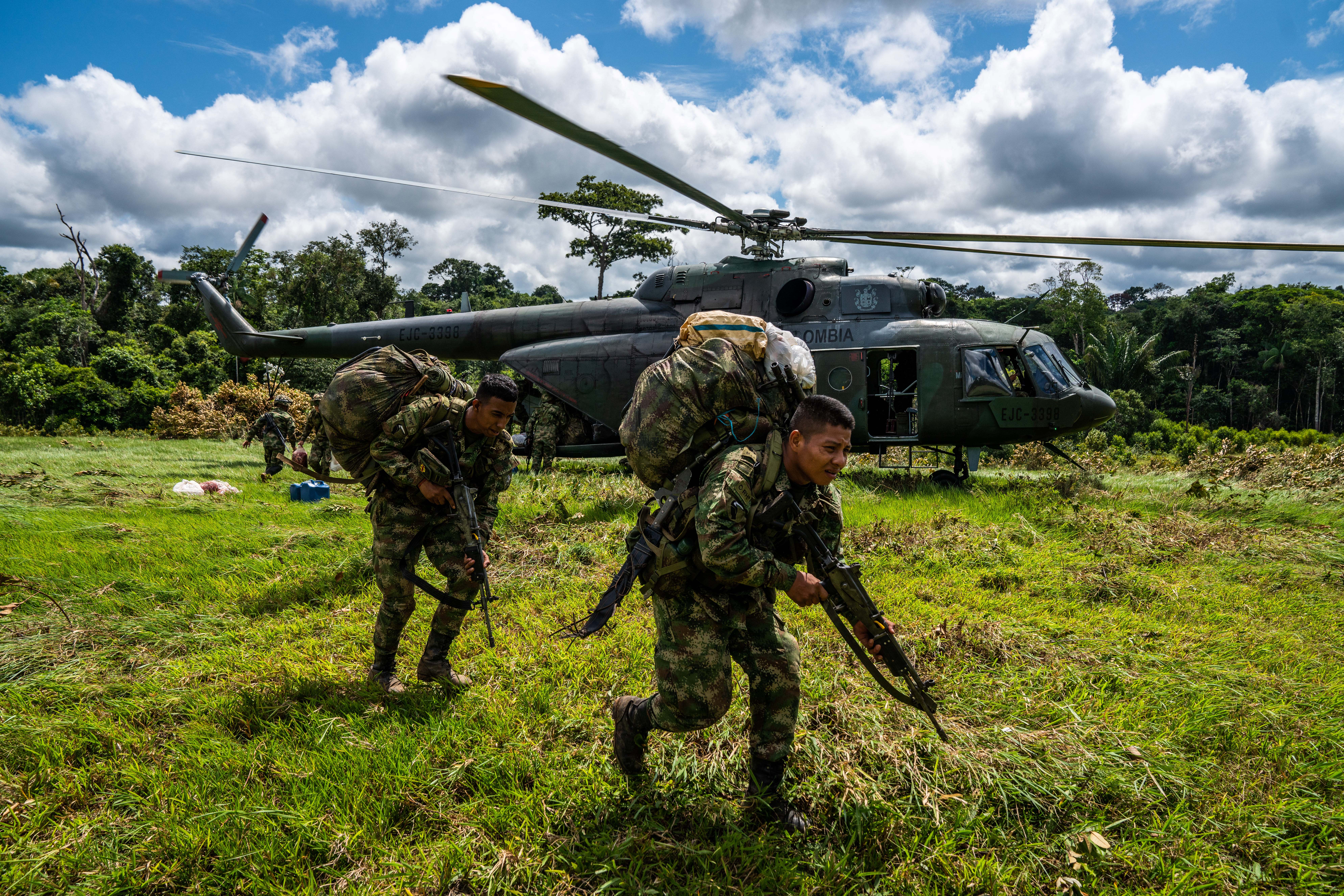 Un grupo de militares aborda un helicóptero tras meses en la selva combatiendo la deforestación en el marco de la Operación Artemisa. Sin embargo, a pesar de los esfuerzos del gobierno, la cifra de deforestación en Colombia ha crecido exponencialmente durante los últimos tres años en los que cada día más hectáreas de selva ceden su lugar a la ganadería extensiva y los cultivos de coca. Fuentes oficiales calculan que unas 200.000 hectáreas de bosque se deforestan cada año en Colombia, cerca del 70% en la Amazonía. Los departamentos más afectados de la región son Caquetá Guaviare y Meta. Dos de los municipios de Caquetá donde se hizo el reportaje, San Vicente del Caguán y La Macarena, concentraron una quinta parte de la deforestación a nivel nacional en 2018, según el IDEAM. Aunque la deforestación se redujo parcialmente en ese año, solo San Vicente perdió casi 20.000 hectáreas, un 10% del total nacional.