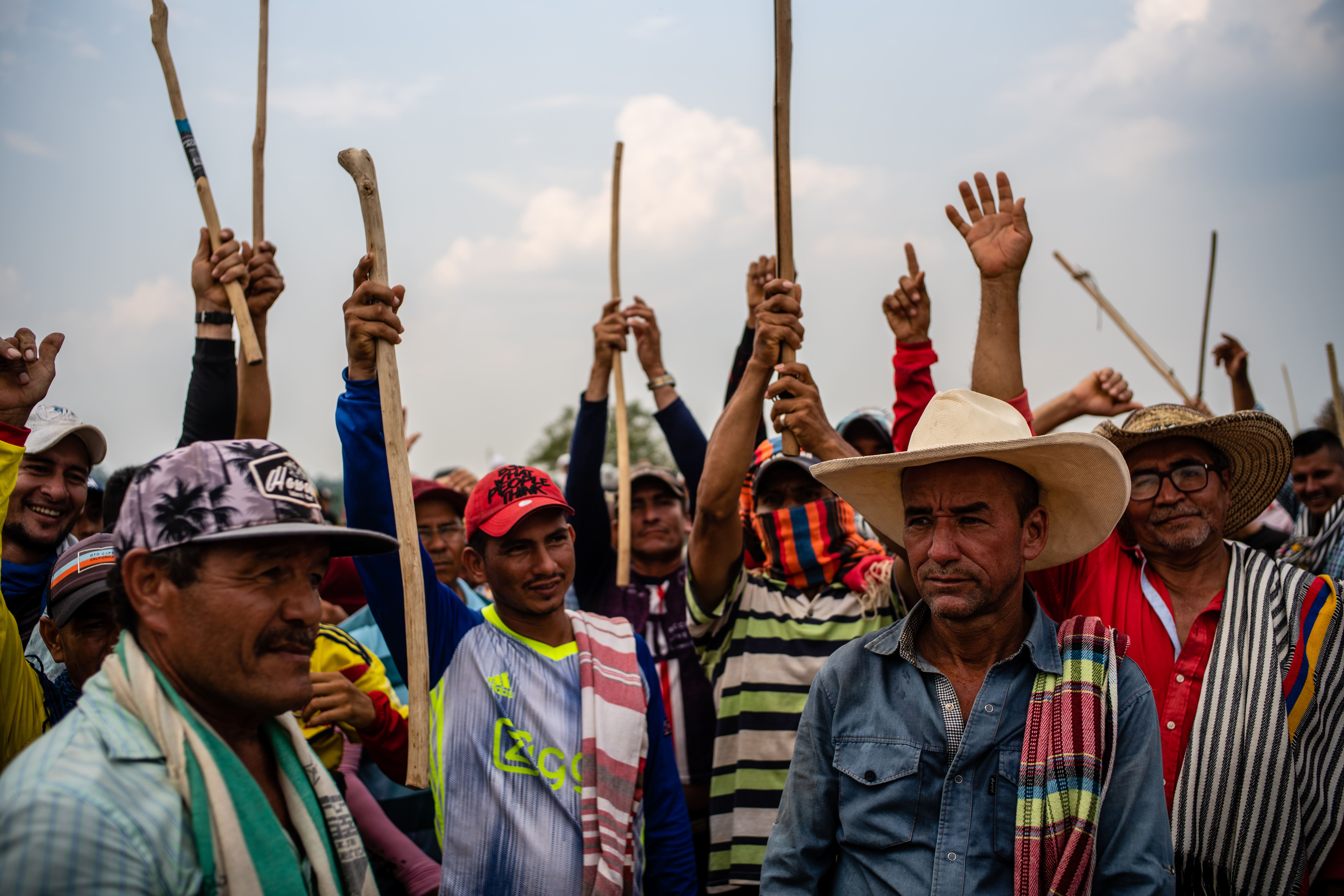 Un grupo de campesinos bloquea la vía que de Los Pozos conduce a San Juan de Lozada, en la región de La Macarena, el 2 de abril de 2019, esperando que el gobierno atienda su llamado de dialogar sobre la Operación Artemisa con la que se han visto severamente afectados. Después de reuniones con el gobierno, se conformó una mesa de negociación que no ha avanzado por dificultades de movilidad durante la epidemia de coronavirus. La protesta se disolvió una semana después.