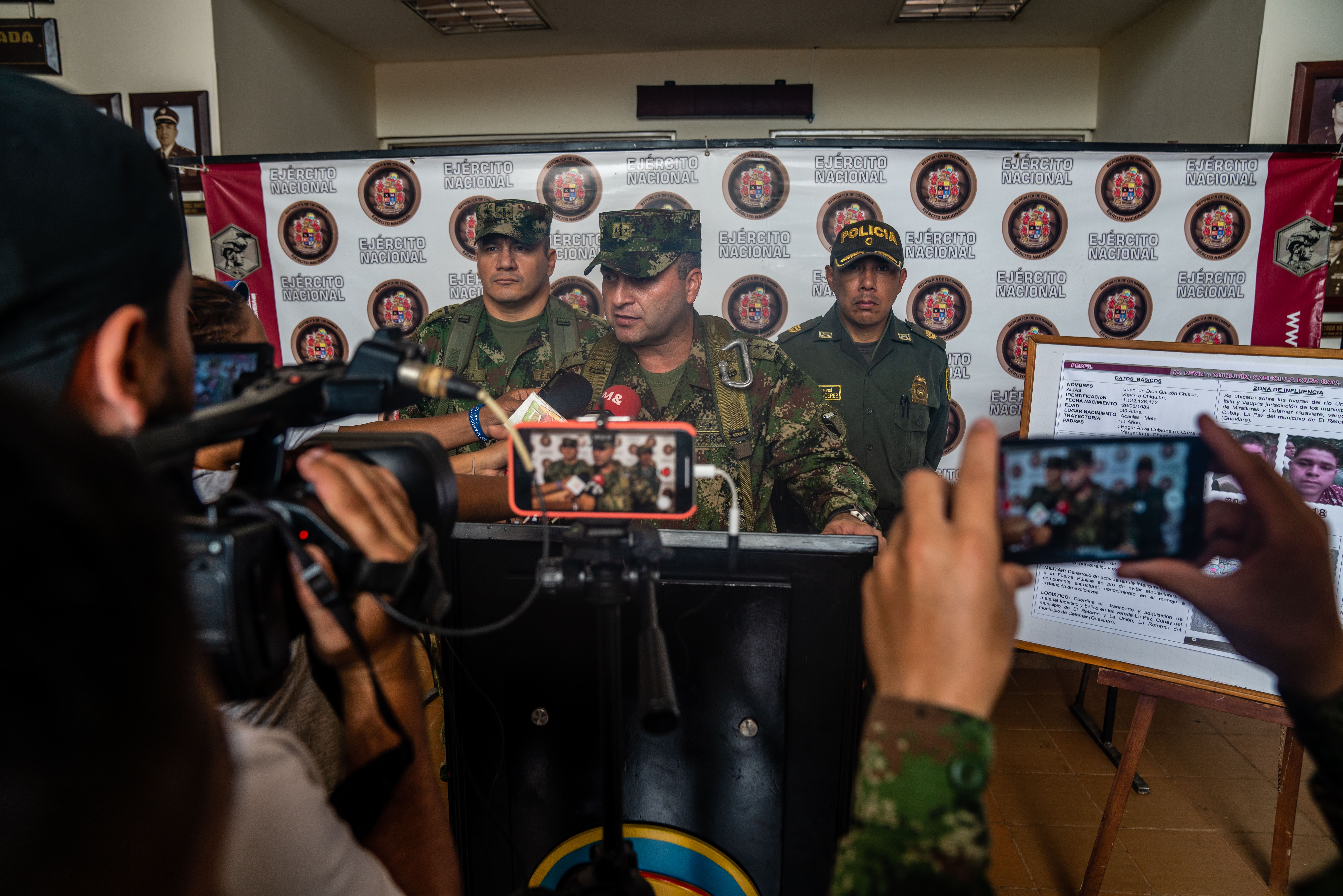 El coronel Norberto Salgado, comandante de la Brigada de Selva 22, con sede en San José del Guaviare, entrega a la prensa, el 23 de octubre de 2019, los resultados de la captura de presuntos miembros de grupos armados señalados de deforestar, cultivar coca y dedicarse al narcotráfico. Como ha ocurrido en otras ocasiones, las operaciones de Artemisa se han concentrado en los eslabones más débiles de la cadena de tala, cultivo de coca y tráficos ilegales. Los más afectados por sus operativos son, además de integrantes de grupos armados ilegales, campesinos como estos. Terratenientes, grandes ganaderos y los políticos que los protegen siguen escapando al control de las autoridades.