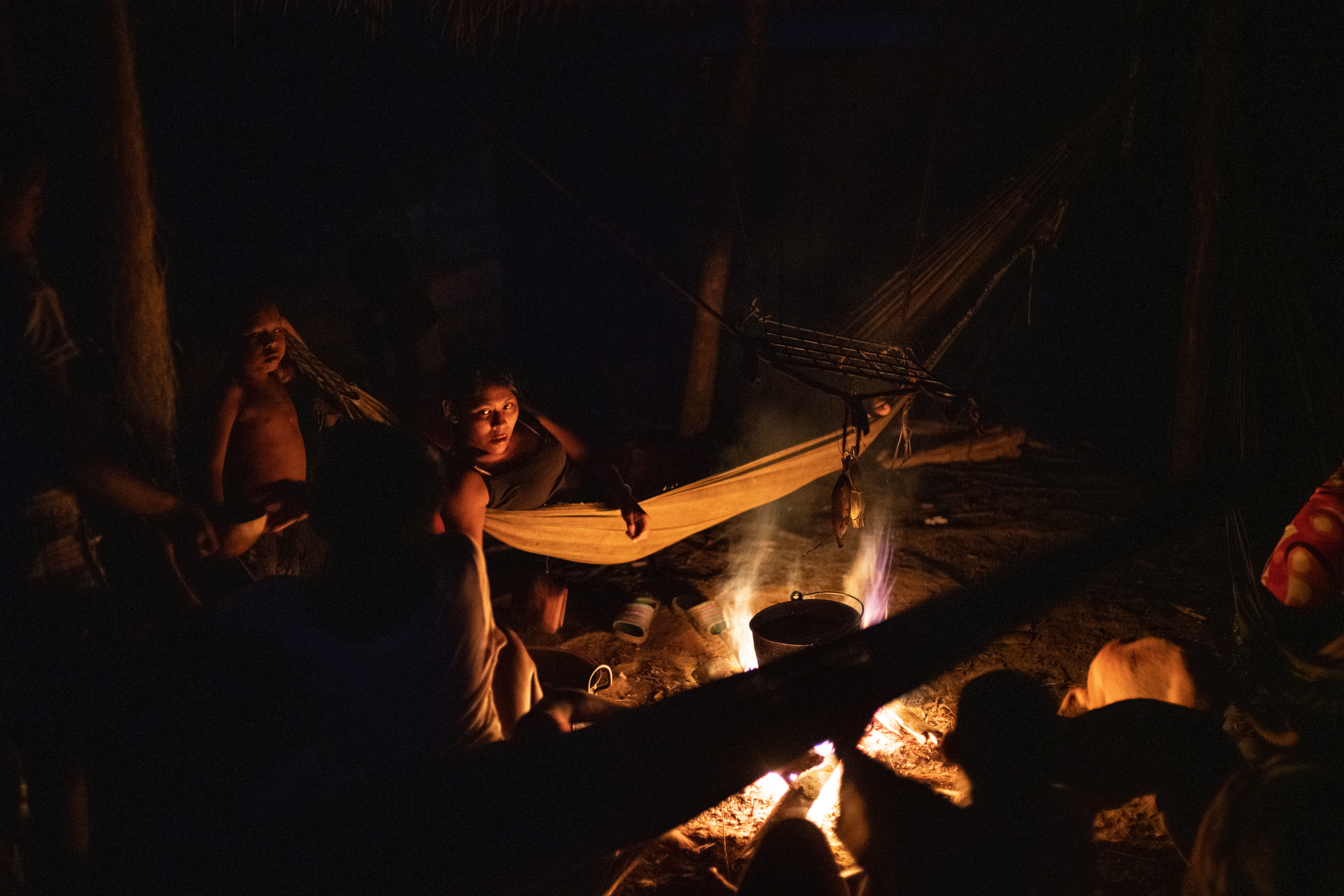 Un grupo de indígenas nukak prepara la cena en el fuego mientras descansan en sus hamacas. Los nukak son un pueblo que permaneció como no contactado hasta 1988 y al que la Corte Constitucional declaró en “riesgo de exterminio étnico y cultural”. Aunque cuentan con un territorio de casi un millón de hectáreas, legalmente constituido como resguardo desde 1993, los nukak han sido desplazados de manera forzada debido a las dinámicas de colonización, deforestación y cultivos ilícitos. Muchos se han visto obligados a asentarse en zonas urbanas en condiciones de extrema pobreza, como ellos, que viven en un lote a las afueras de San José del Guaviare.