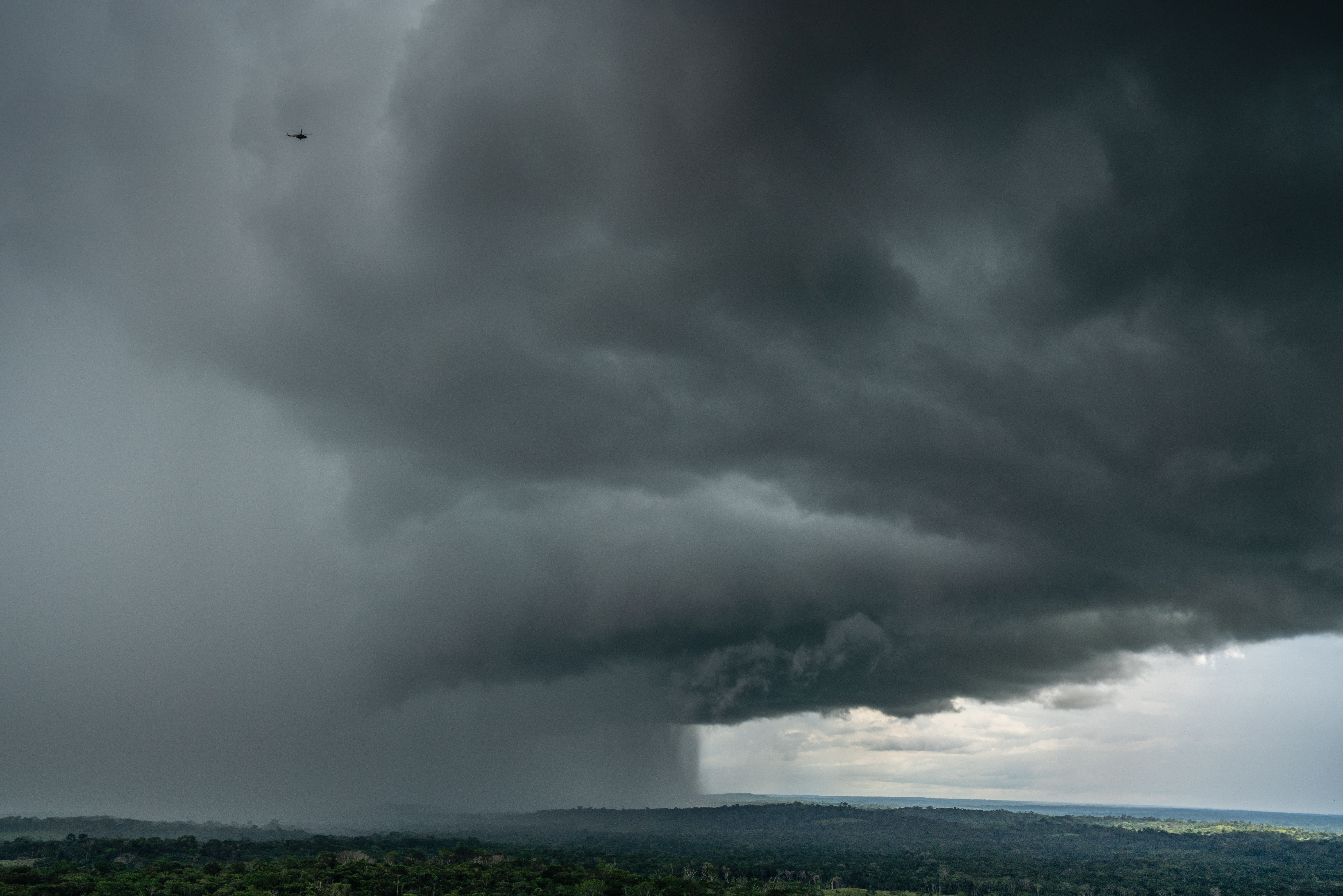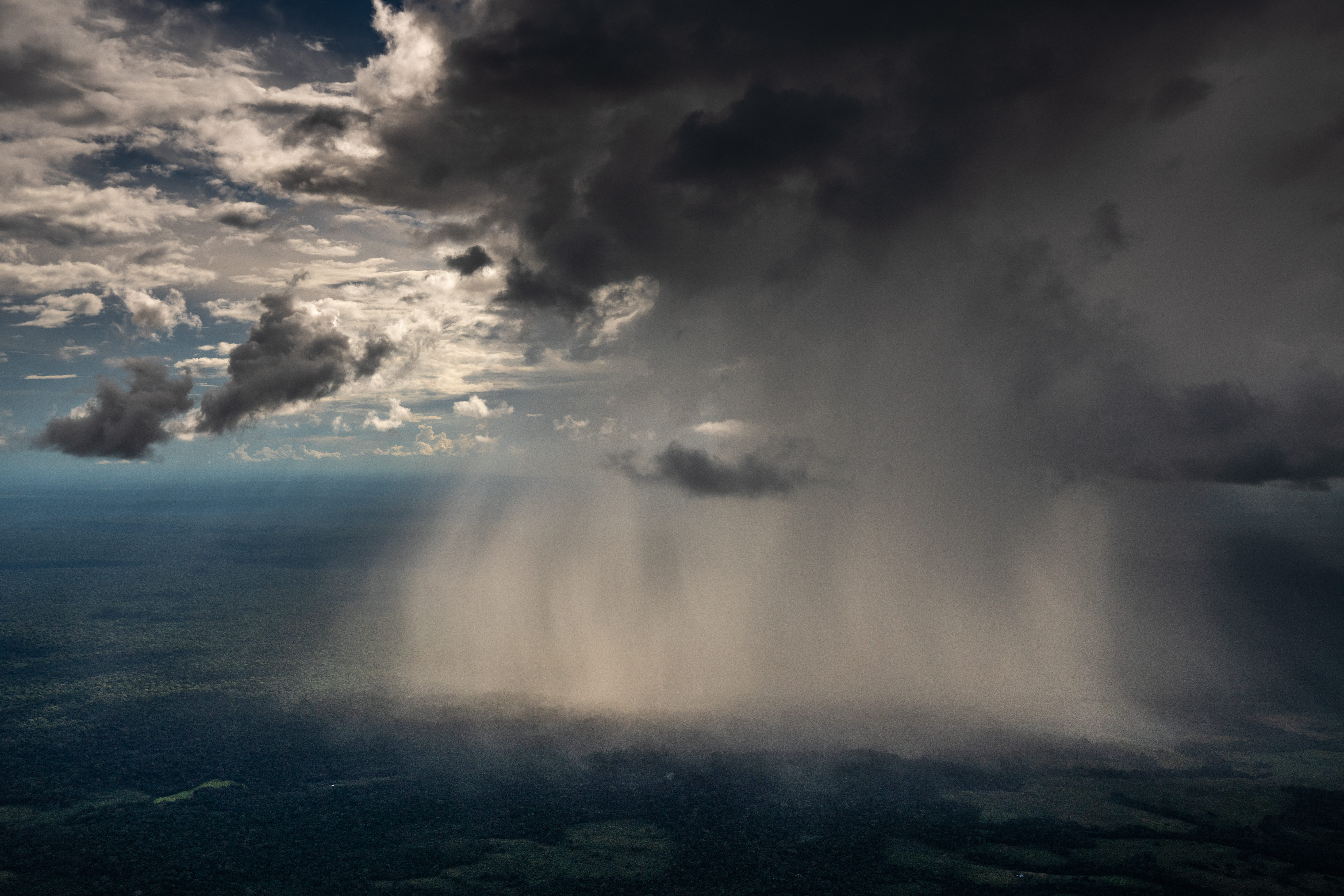 Aguaceros como este caen regularmente sobre la selva del Guaviare. En el suelo, se notan los parches que va dejando la deforestación. La selva tropical cumple un papel clave regulando el ciclo del agua en todo el planeta.