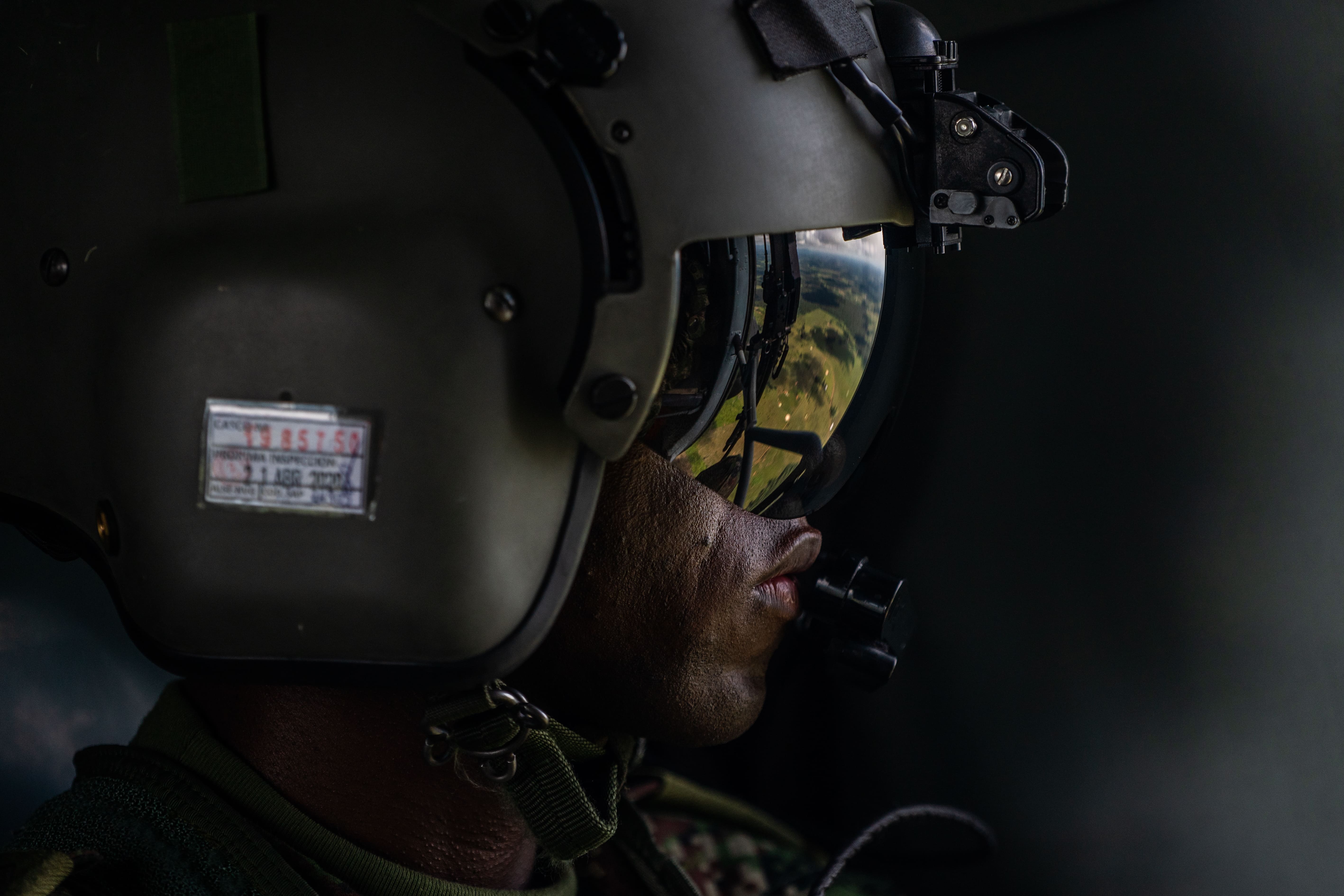 Un militar a bordo de un helicóptero del ejército. Estas aeronaves patrullan y abastecen a las tropas de tierra de la Operación Artemisa, que pueden pasar meses en la selva antes de ser relevadas. El personal militar es la única presencia, ocasional, del Estado colombiano en estas zonas remotas en las que son grupos armados, algunos de ellos disidencias de la exguerrilla de las FARC, los que tienen el control sobre los pobladores.