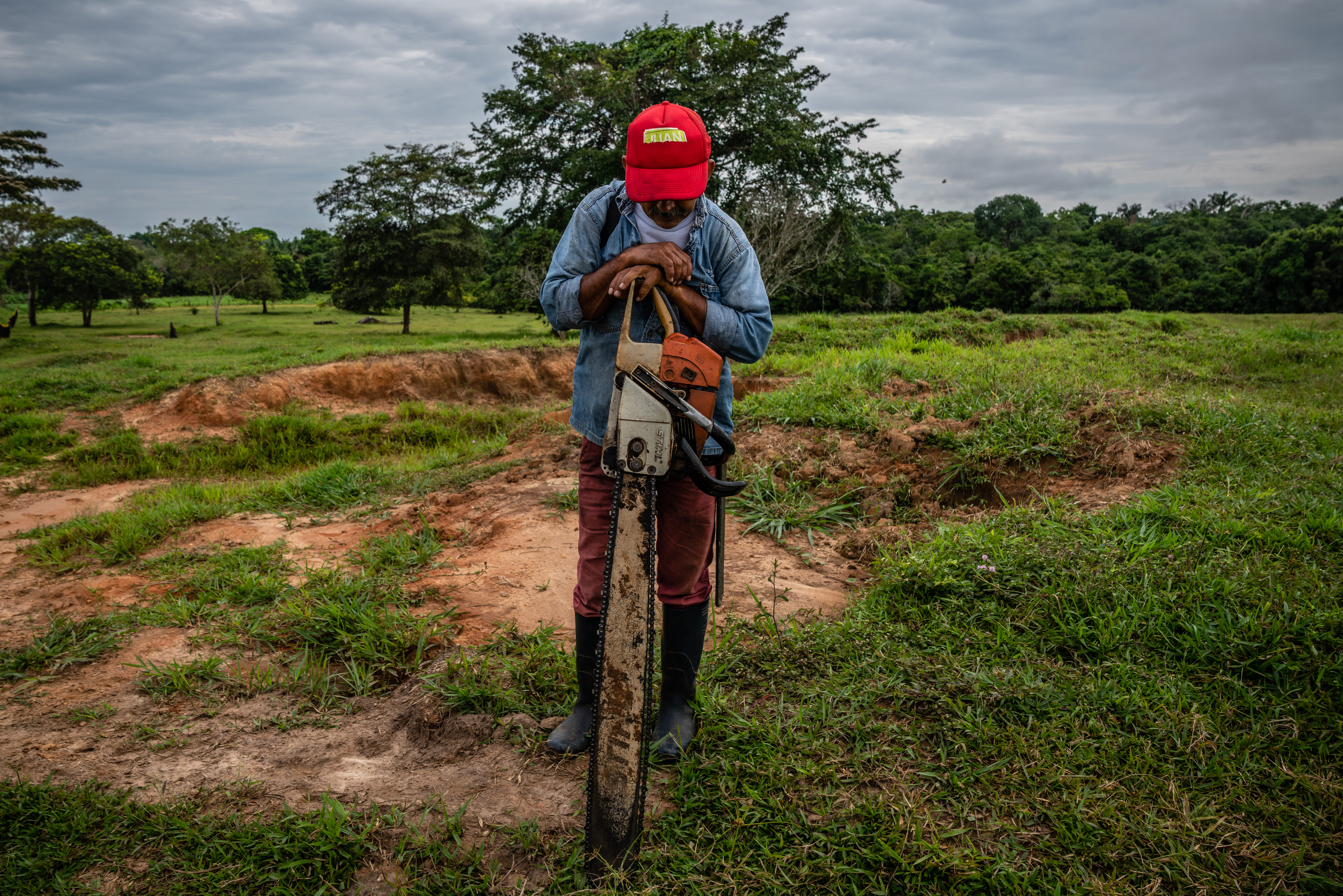 Un campesino con su motosierra en medio de un lote de ganadería. La motosierra ha sido una herramienta indispensable en la colonización y deforestación de la selva. Basta un poco de combustible y con ella se pueden tumbar hectáreas de selva muy rápidamente.