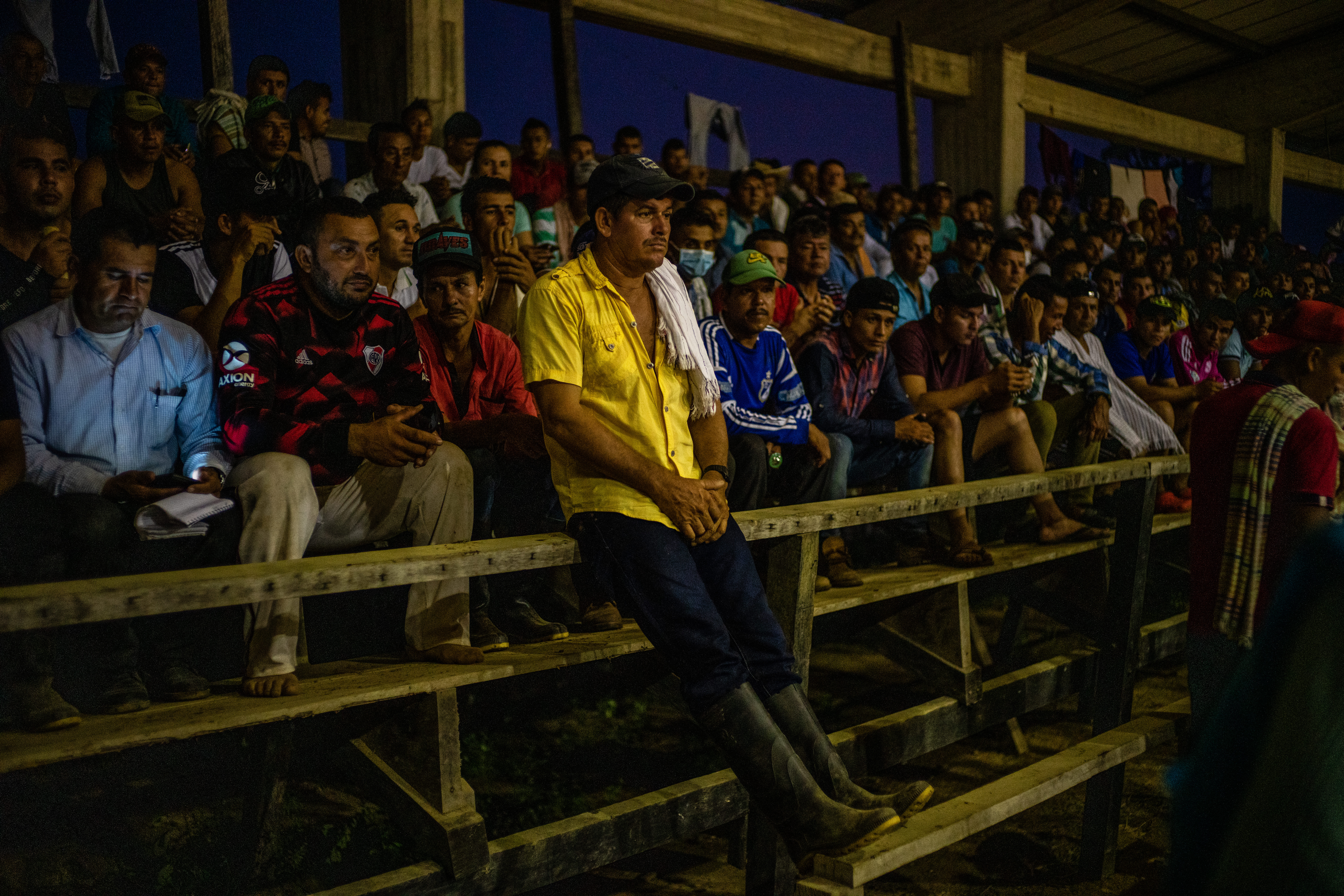 Campesinos reunidos en el coliseo de San Vicente del Caguán, en marzo de 2020, para manifestarse en contra de las medidas tomadas por el gobierno para judicializarlos por vivir en zonas de parques naturales. Las protestas terminaron sin resultados claros para los campesinos. Varios de ellos, detenidos por el ejército, incluso algunos menores de edad, terminaron siendo liberados, sin cargos.