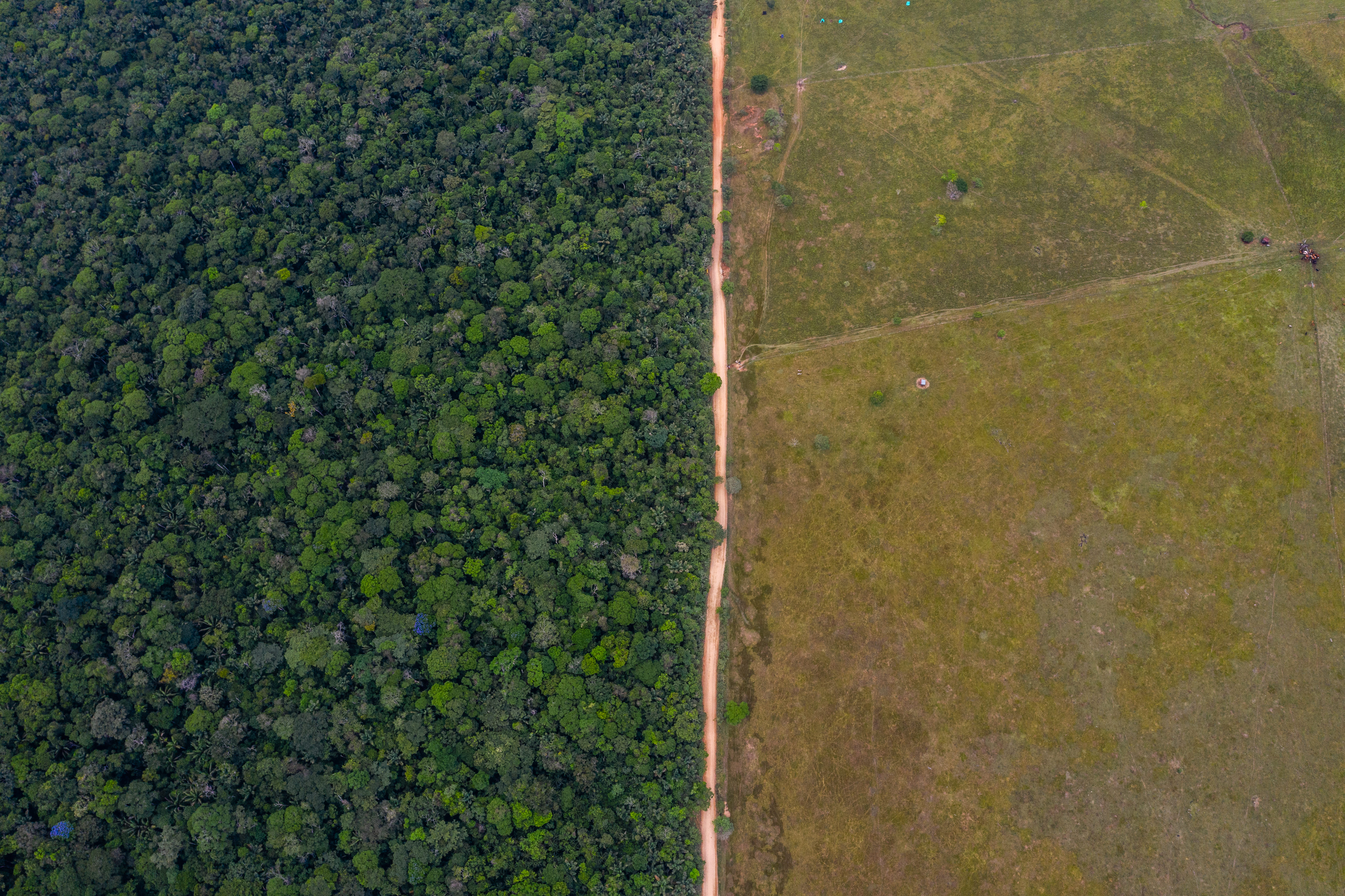 La geometría de la deforestación: una carretera entre los poblados de Los Pozos y San Juan de Lozada, en Caquetá, marca la división entre selva y potrero, entre el mundo salvaje y la ‘civilización’, que cada día gana terreno para generar tierras para la ganadería. Las carreteras son la punta de lanza de talas masivas, como lo ha sido la vía ilegal de 138 kilómetros entre Miraflores y Calamar, en Guaviare.