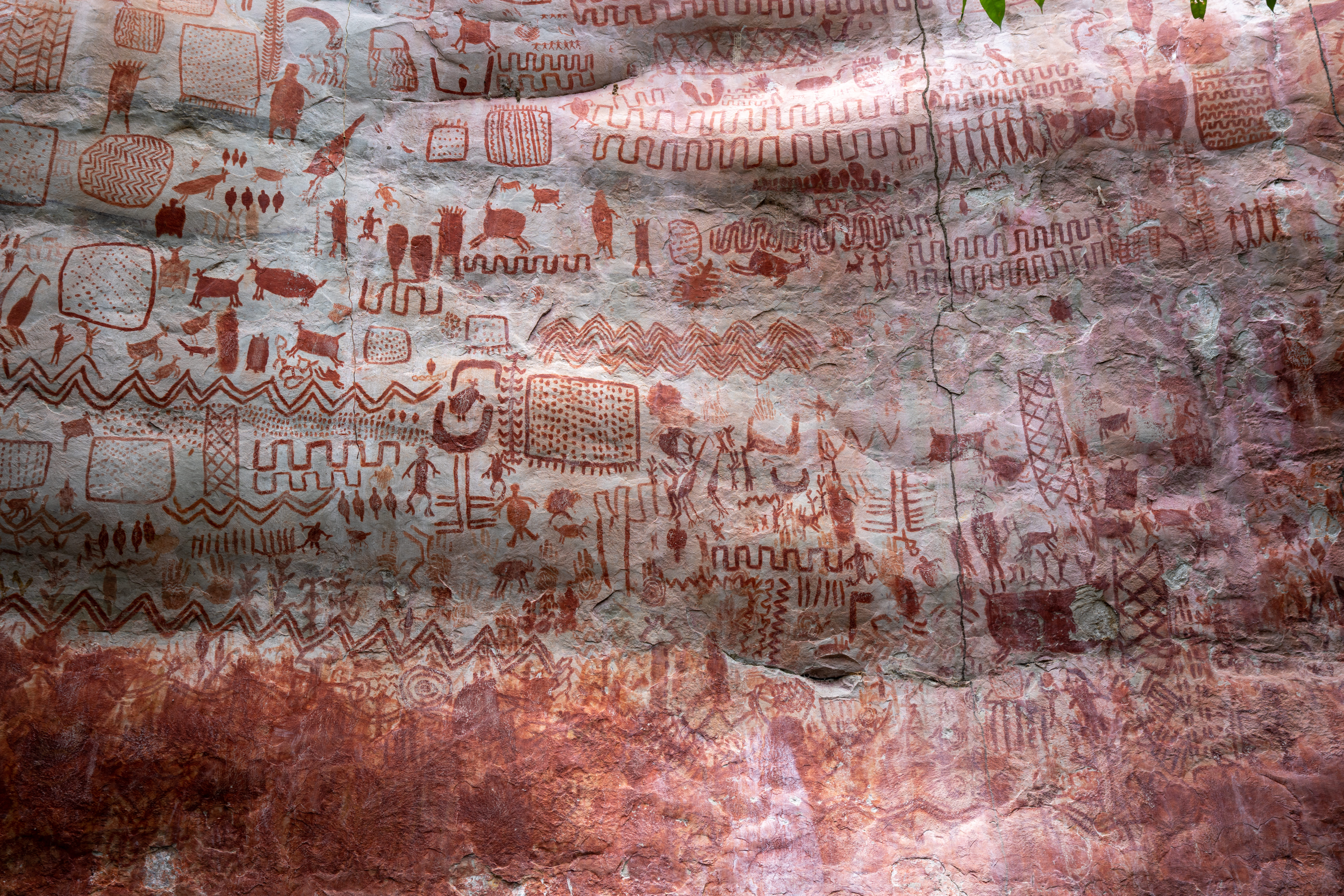 Pinturas rupestres en Cerro Azul, en La Lindosa, cerca a San José del Guaviare, donde se calcula existen unas 45.000 pinturas. La región del Chiribiquete también alberga este tipo de representaciones, más de 70.000, muchas de varios miles de años de antigüedad, que han arrojado nuevas pistas sobre el origen del poblamiento humano en Latinoamérica, así como sobre rituales y detalles de la vida cotidiana de los indígenas de la región y su relación con el entorno. El avance de la deforestación expone cada vez más a culturas indígenas que viven aún aisladas en la selva y pone en peligro este tipo de patrimonio.