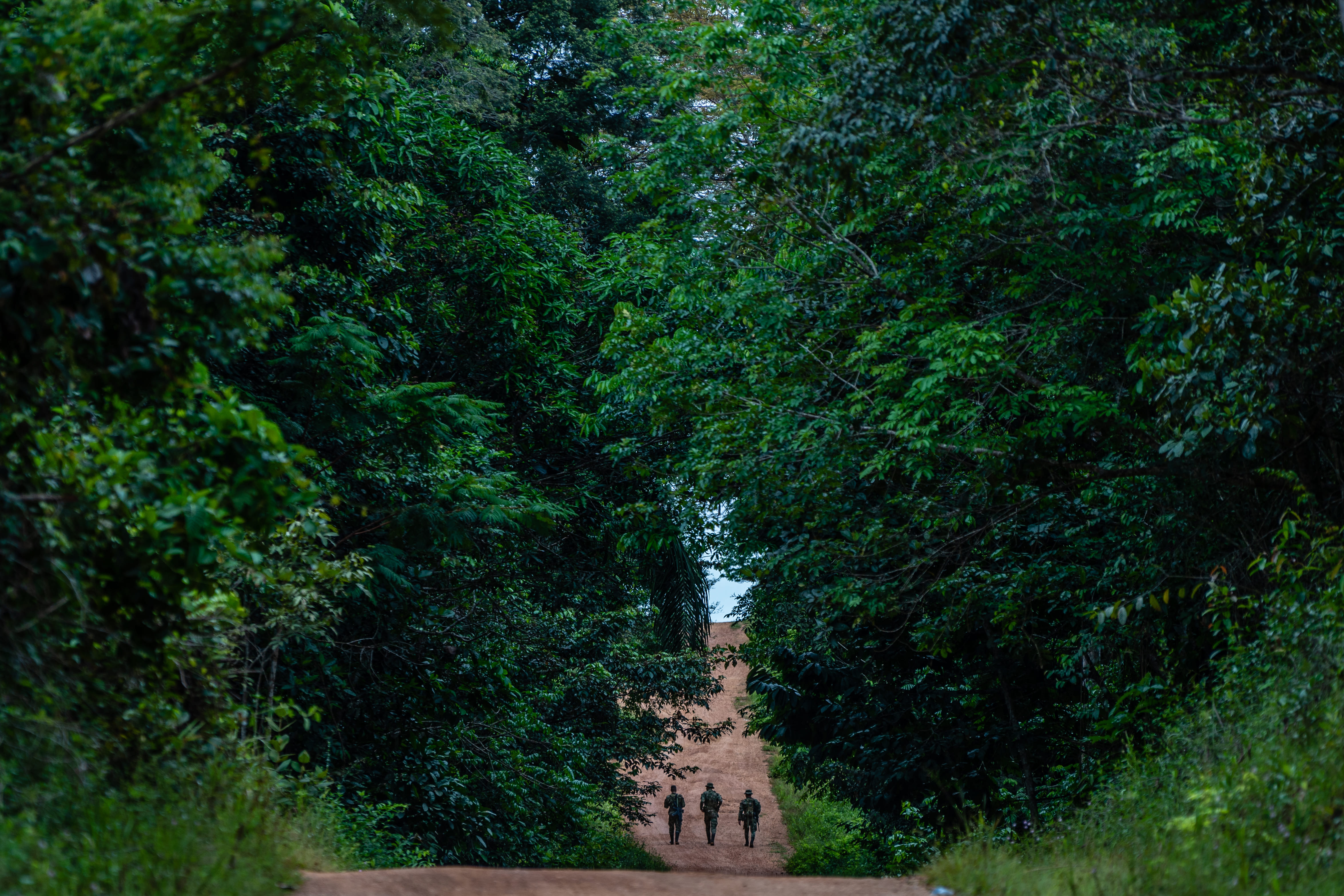 Un grupo de soldados patrulla a pie la selva para monitorear la deforestación, cerca de Cerro Azul, en San José del Guaviare. En general, solo se topan con pequeños colonos campesinos, asentados históricamente en un territorio donde no hay títulos de propiedad ni organismos de control del Estado de ningún tipo, al que llegaron forzados por las circunstancias de escasez y falta de empleo en sus zonas de origen.