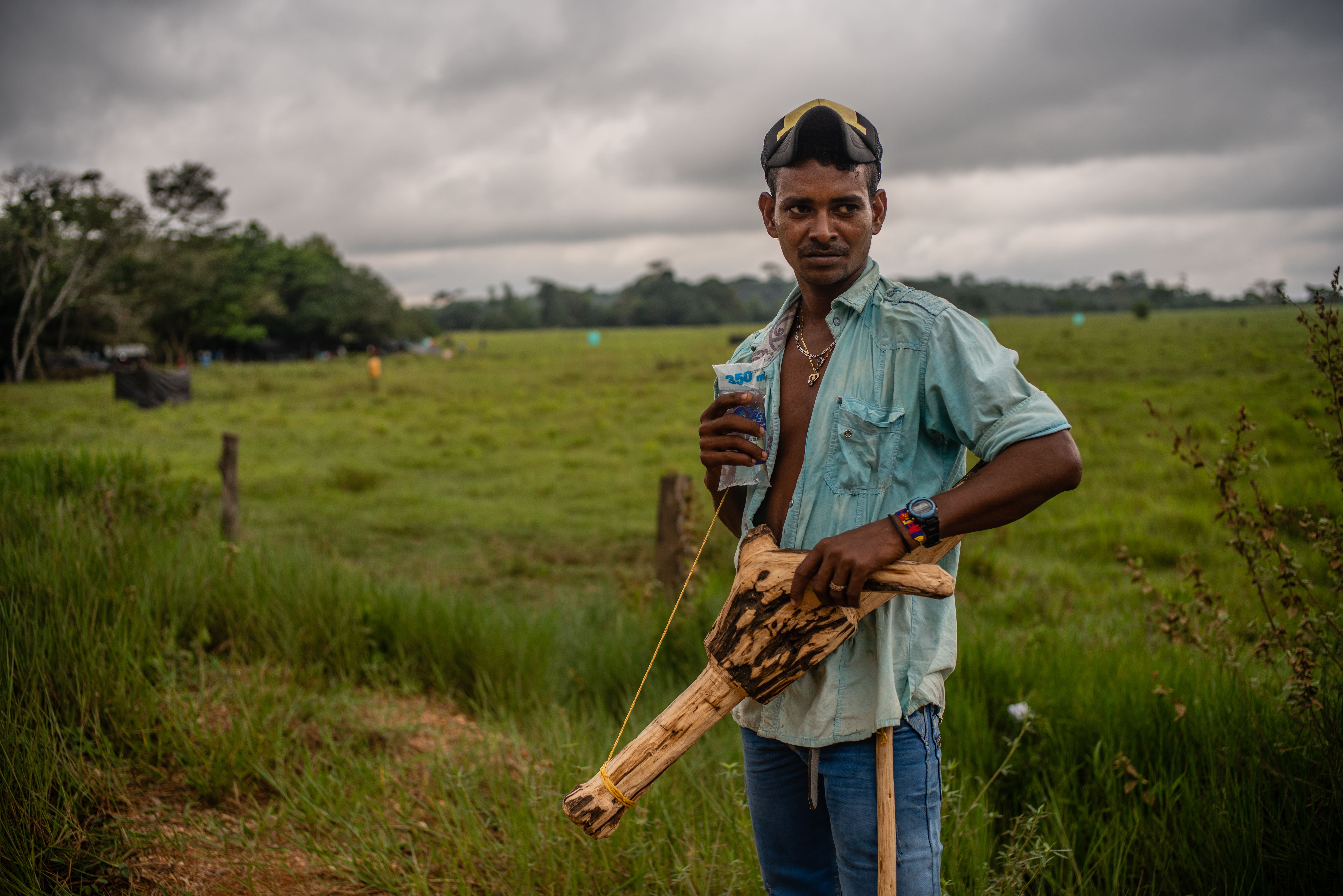 Un campesino armado con un palo de madera durante el bloqueo de los campesinos en la vía que comunica Los Pozos con San Juan De Lozada para llamar la atención del gobierno sobre la situación que viven por la Operación Artemisa. El bloqueo se mantuvo por varios días, durante los cuales los campesinos armaron un campamento para mantenerse. La protesta terminó sin grandes acuerdos.
