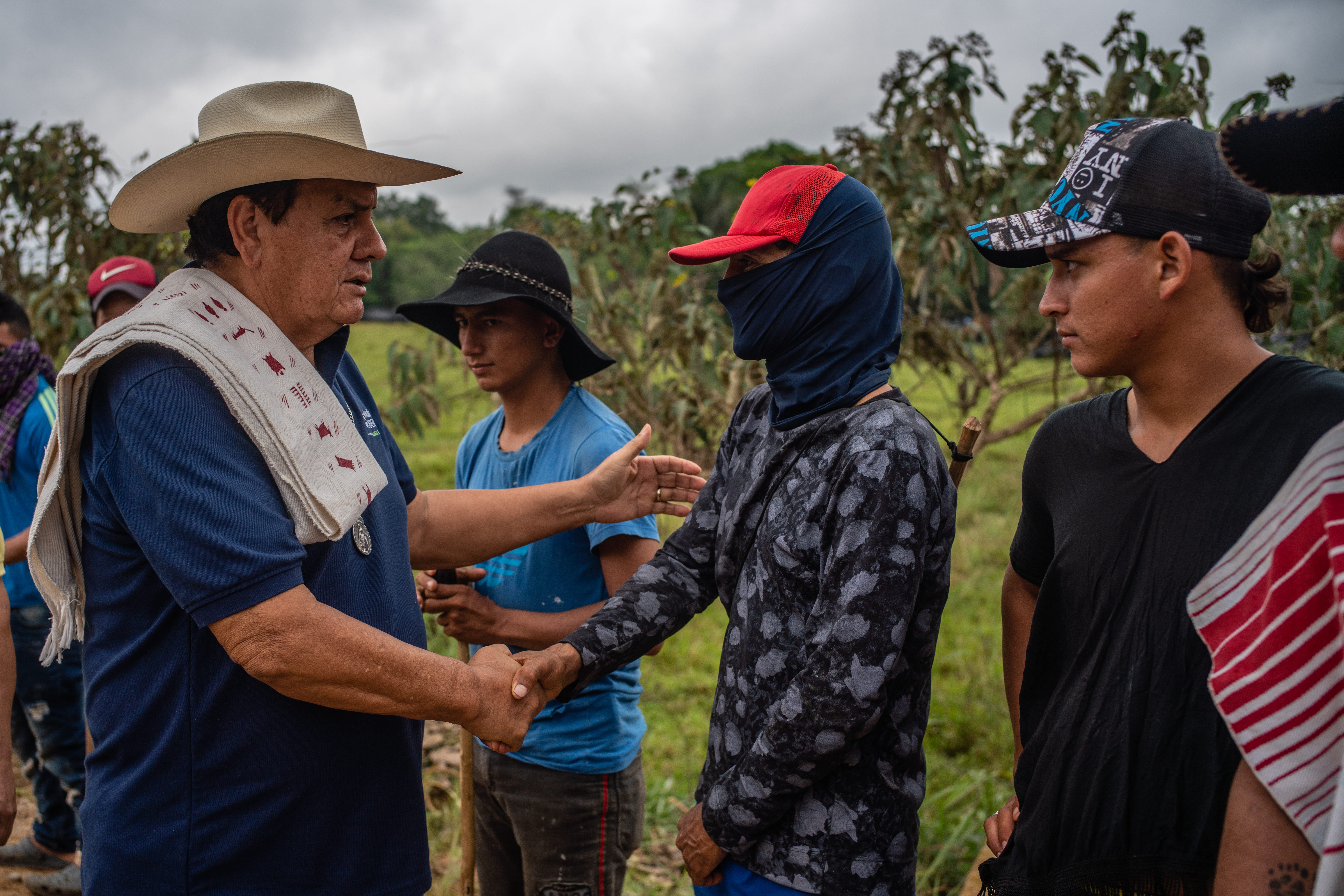 Arnulfo Gasca, gobernador del Caquetá, estrecha la mano de varios campesinos. Durante el bloqueo de la vía entre los poblados de Los Pozos y San Juan de Lozada, demandaron al gobierno dialogar sobre la Operación Artemisa y los riesgos que representa para ellos. Gasca, un polémico ganadero y criador de caballos finos, con un pasado que ha despertado cuestionamientos e investigaciones por presuntos nexos con el narcotráfico, que no se han comprobado, fue elegido gobernador del departamento en 2019, con apoyo del Partido Conservador. El país lo conoce por un video que se hizo grabar años antes al mejor estilo norteño en el que se denomina ‘patrón de patrones’.