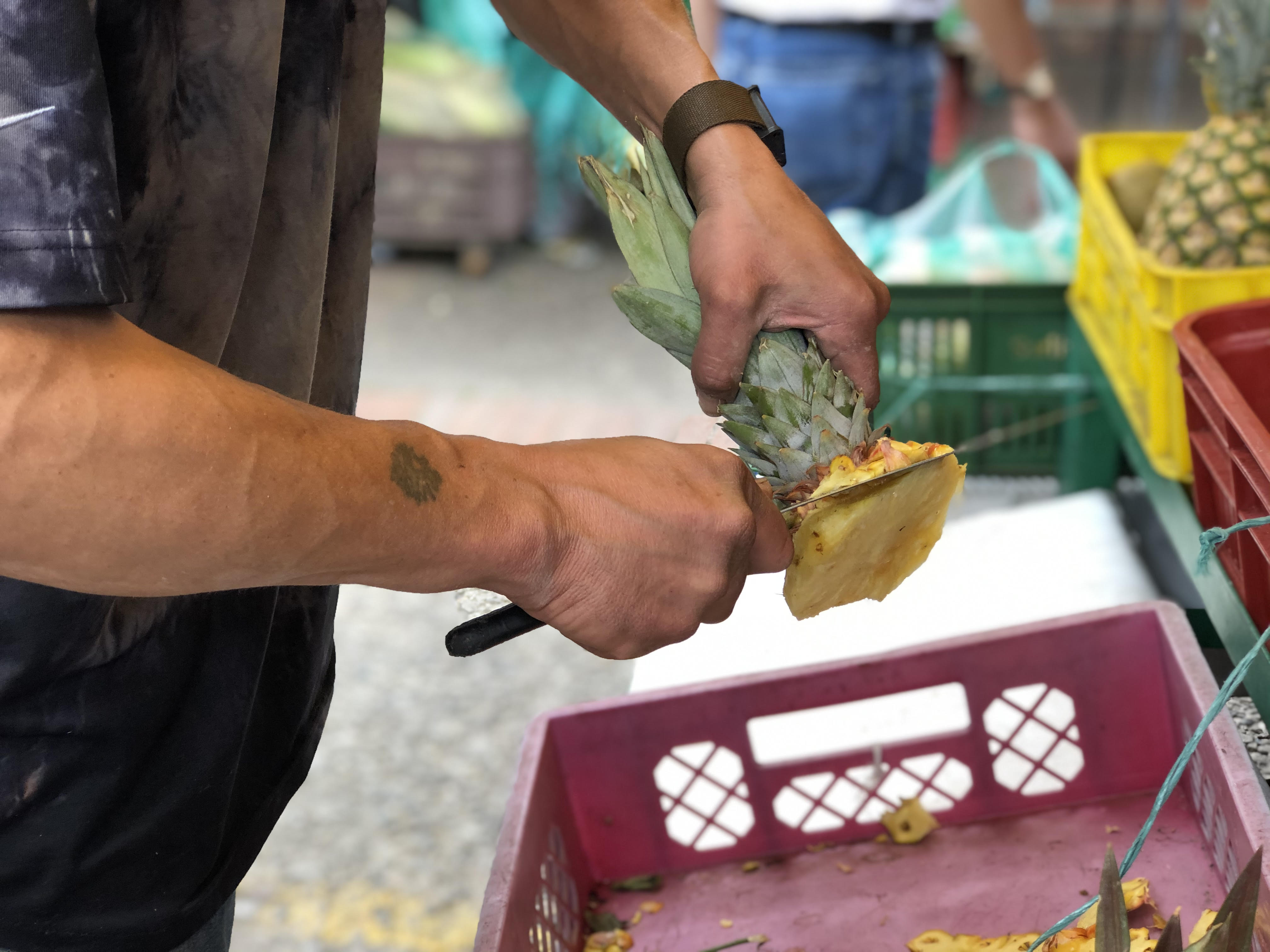 Otra de sus funciones en la plaza es pelar la fruta que la señora Isaura tiene para guardarlas en bolsas y venderlas listas para comer.
