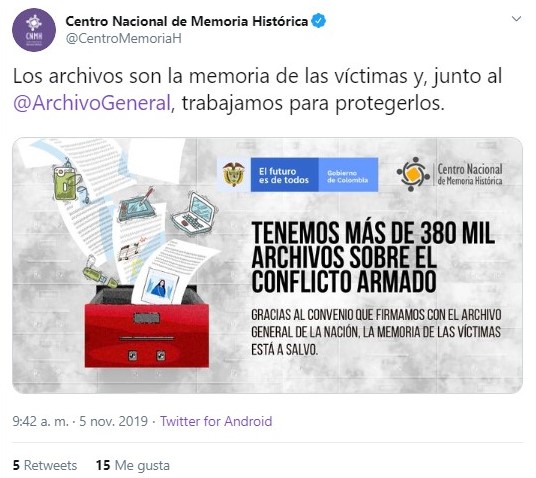 En días pasados el director del Centro Nacional de Memoria Histórica (CNMH) dijo que había hecho un convenio con el Archivo General de la Nación para que le organizara los archivos. La diferencia es quién va a accionar el gatillo, en este caso no va a ser una empresa equis, como Tandem, que está haciendo lo suyo en la Defensoría del Pueblo, sino que el AGN es el que va a picar la información de las víctimas que le han donado colecciones al CNMH. Es así de sencillo.