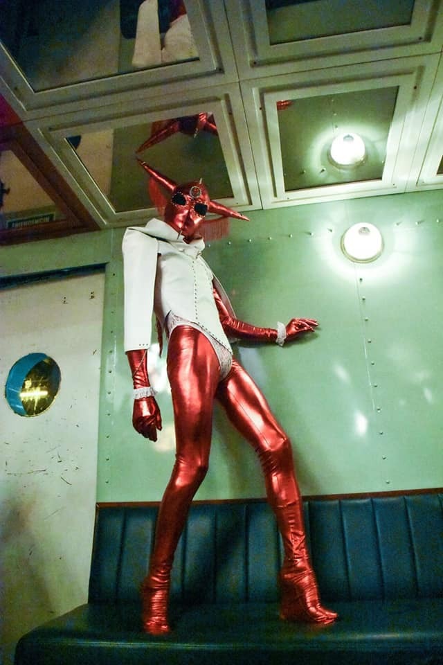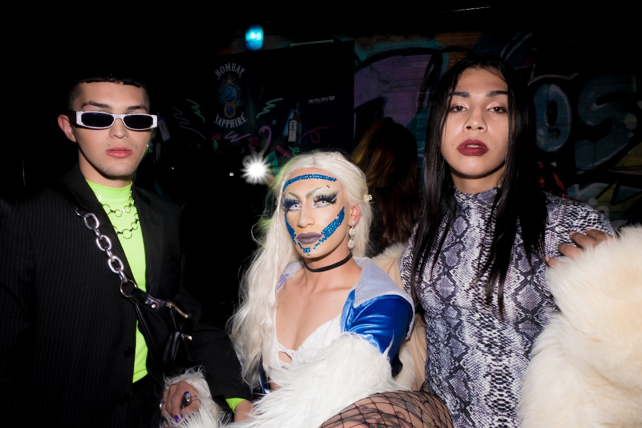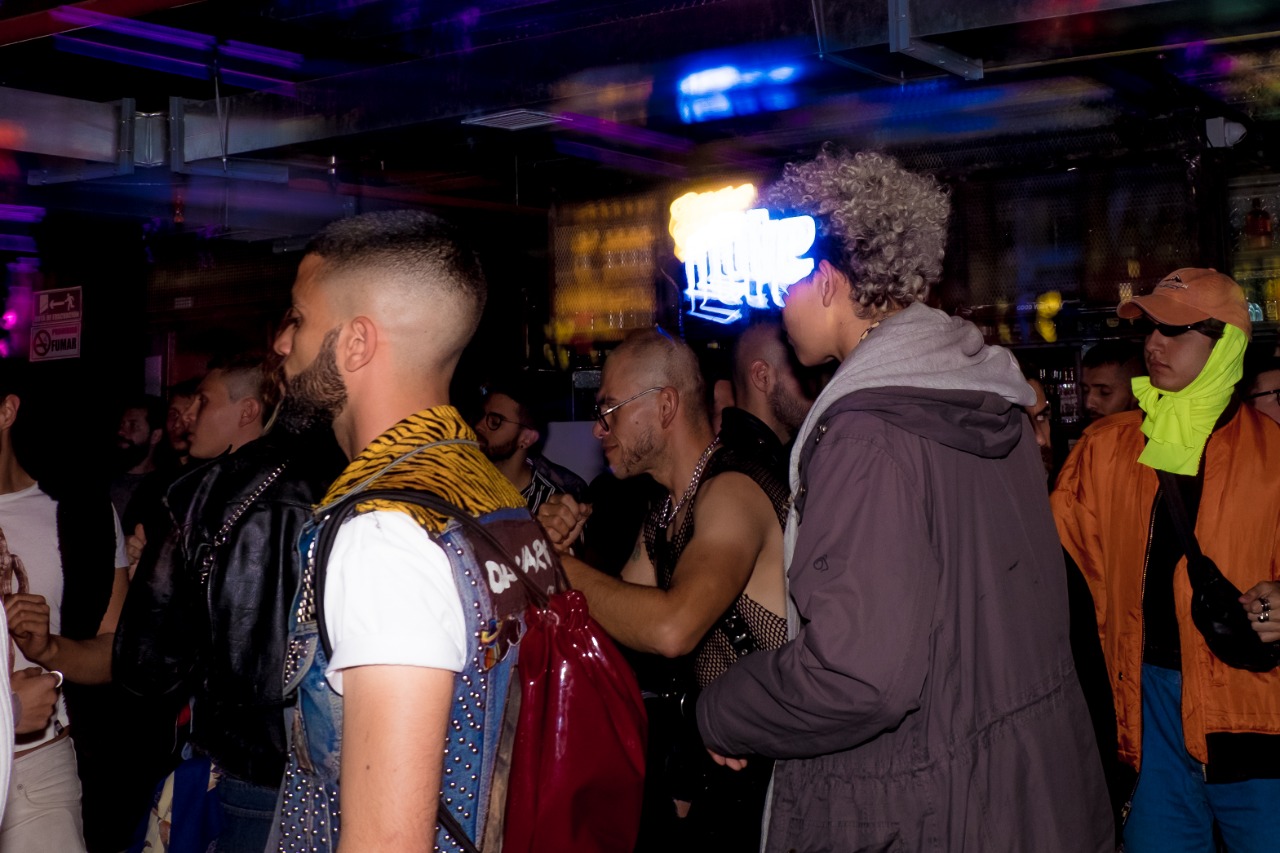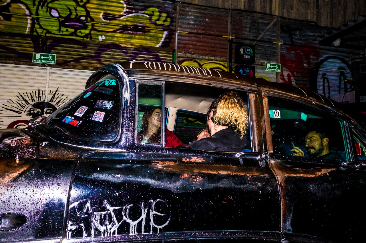 En el centro del patio, bajo un cielo descubierto, hay un auto clásico lleno de grafitis. Está iluminado desde el suelo, en su interior tiene asientos de cuero azul y, en el baúl, una bañera. Sin embargo, esa noche el auto se ve opacado por los atuendos de los asistentes: accesorios extravagantes, animal print, cuero, charol, plataformas, neón, lana, plumas, metal, corsés, pelucas, uñas, lentes, trajes, vestidos, capas, coronas, gafas, máscaras y maquillaje.