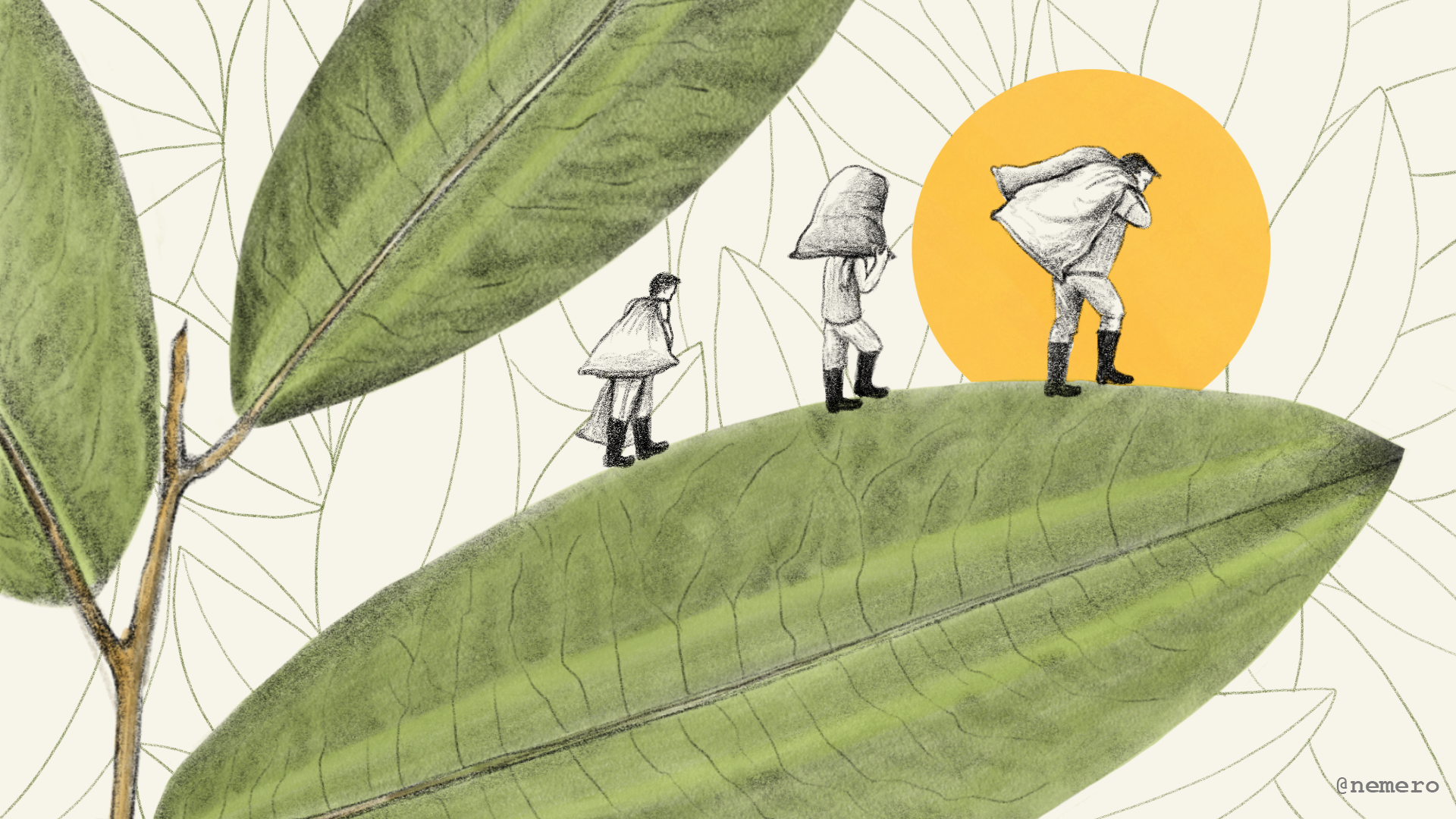 Cuando escoge a los hombres, “el patrón” informa que del pago se descuenta el dinero de la comida y el hospedaje. “La jornada comienza a las siete de la mañana y termina a las once, la primera ronda. Paramos para descansar y comer, y volvemos a las dos de la tarde y hasta las cuatro”, cuenta José. En la finca, los trabajadores más antiguos le explicaron cómo era el procedimiento: tomar la rama y jalar la hoja. “Los primeros días me saqué sangre en las manos”, recuerda.