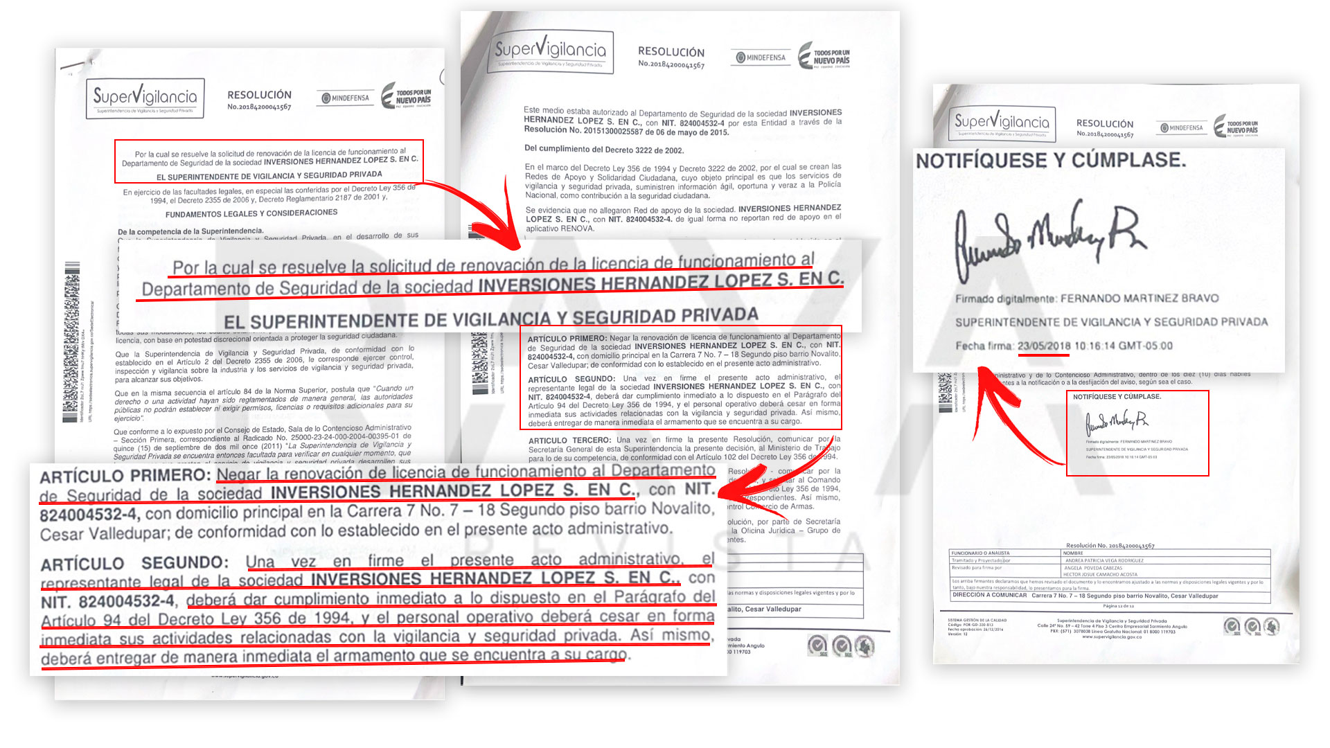Resolución de la SuperVigilancia donde negó la renovación de licencia de funcionamiento al departamento de seguridad de la empresa del ‘Ñeñe’.