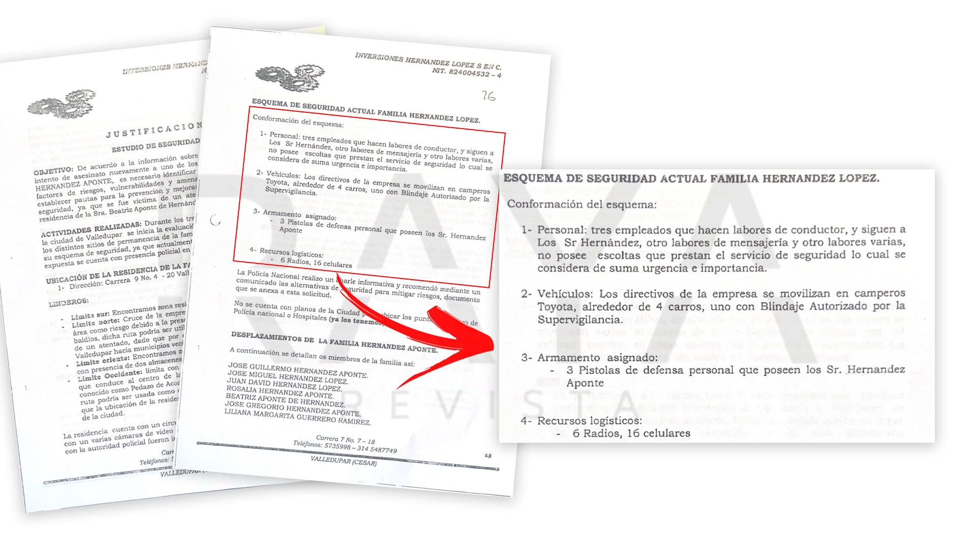 Por eso, a principios de 2014 el ‘Ñeñe’ Hernández empezó a allanar el camino para tener un grupo de hombres armados para proteger su vida y la de su familia, ya que los sicarios lo empezaron a señalar ante la Fiscalía como el determinador del crimen. El abogado Coquies Maestre recibió el poder de Hernández para representarlo ante la SuperVigilancia. Entre el 15 de junio y el 15 de agosto de 2014, Coquies Maestre realizó el estudio de seguridad con el que el ‘Ñeñe’ terminó de argumentar ante la SuperVigilancia por qué su empresa Inversiones Hernández López S. En C. necesitaba los escoltas y las armas. Según Coquies, “por la información de un posible secuestro e intento de asesinato nuevamente contra uno de los miembros de la familia Hernández Aponte”.