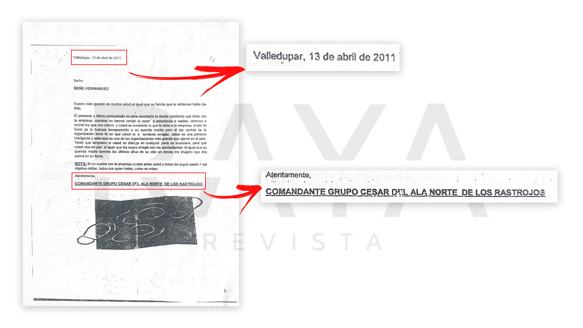 En ese documento inédito detalló un supuesto encuentro que tuvo con Los Rastrojos en Barranquilla durante una cita que le habría solicitado Carlos Rodríguez, el sastre, en 2010. “Me abordó el comandante o líder de Los Rastrojos, quien se hacía llamar Harold, quien físicamente es de estatura 1.75, trigueño, de 40 años y acento caleño. En la conversación él me dijo que tenía que pagarles la plata a ellos, la plata que le debía al señor Carlos Rodríguez. Como yo le decía que no le debía, él llamó al celular de Carlos Rodríguez y en mi presencia escuché cuando le decía a Harold que sí, que yo sí le debía el dinero a él y que tenía que pagarles el dinero como diera lugar”.