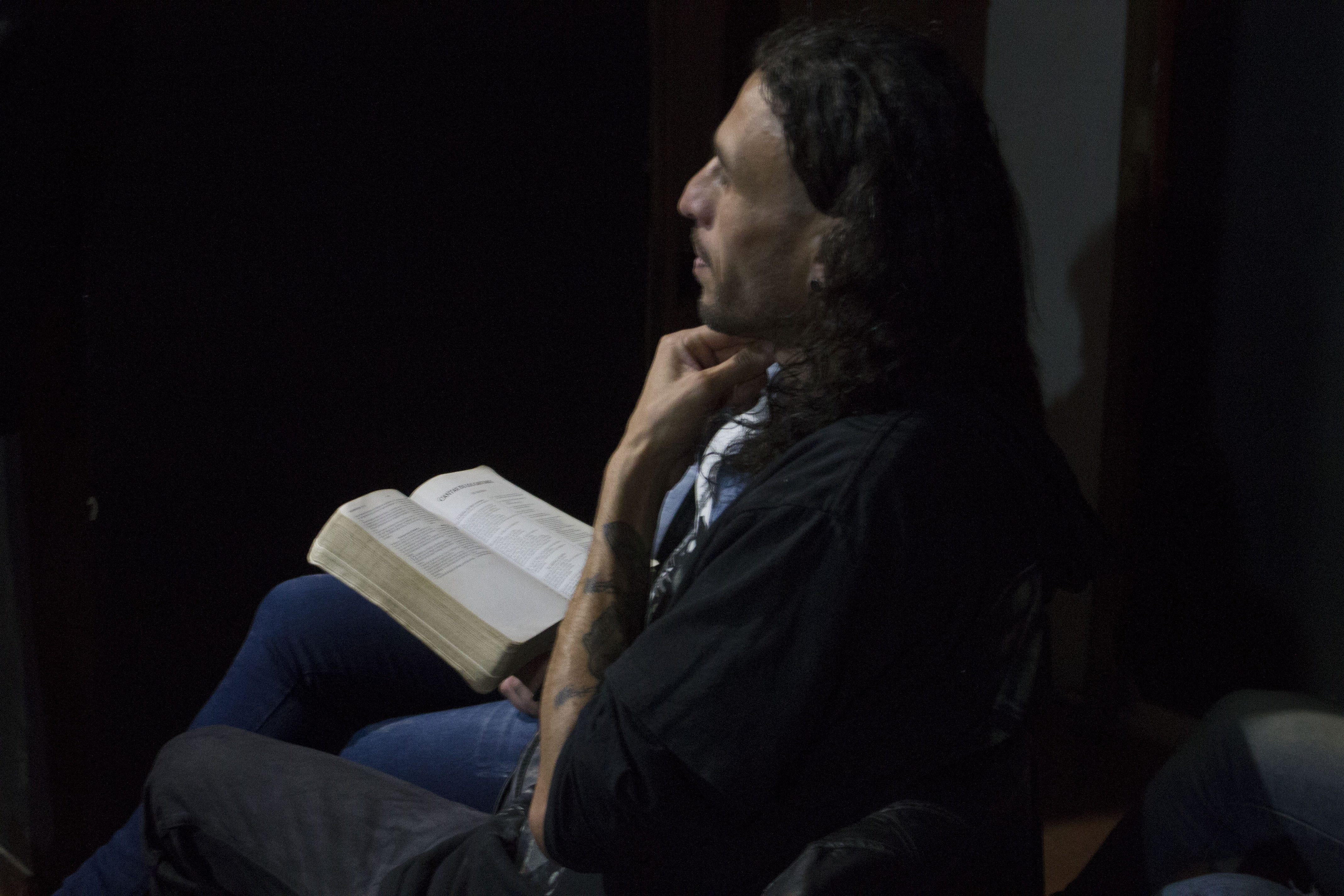 Con el sonido de las cadenas que cuelgan de su pantalón, Carlos se sienta, acomoda sobre su nariz las gafas de marco blanco y negro y toma su biblia. Está forrada en cuero y en el centro de la portada tiene tres taches pegados en línea vertical y tres en una línea horizontal, que juntas forman una cruz. La abre para buscar el libro de Hechos y lo encuentra como quien sabe de memoria qué tiene guardado en su mesa de noche. Se detiene en el capítulo 17, aclara su garganta y con voz firme, suave y pausada lee el sexto verso: “pero no hallándolos, trajeron a Jasón y a algunos hermanos y los arrastraron ante los gobernadores, gritando: ¡Estos que trastornan el mundo también han venido hasta aquí!”. Alza la mirada y dice: