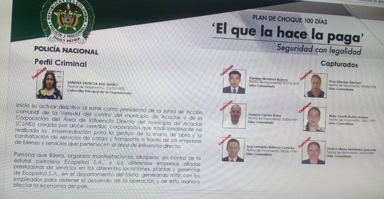 De hecho, en redes sociales circuló una imagen con el logo de la Policía Nacional, en la que informaban la captura de los siete líderes, entre los que se encontraba Carrión. La ‘organización criminal’, según la imagen, estaba liderada por Sandra Patricia Ruiz Riaño, una de las capturadas del 10 de septiembre. “Inició su actuar delictivo al estar como presidenta de la Junta de Acción Comunal de la vereda del centro del municipio de Acacías. (…) Persona que lidera, organiza manifestaciones, bloqueos, en contra de la estatal petrolera Ecopetrol S.A.”, relata el perfil criminal de la pieza gráfica, de la que no ha sido posible verificar su autoría. En la parte superior de la imagen, reposa una de las frases insigne del gobierno actual: “Plan de choque 100 días, ‘El que la hace la paga’. Seguridad con legalidad”.
