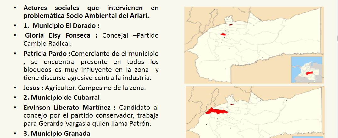 En este documento se nombran a varios líderes y organizaciones ambientales que participan en protestas y plantones, además, de cómo han sido sus reclamos. Patricia Pardo, lideresa de Cubarral, es descrita como “Comerciante del municipio, se encuentra presente en todos los bloqueos, es muy influyente en la zona y tiene discurso agresivo contra la industria”. También, señala al sacerdote de El Castillo de “emitir discursos en contra de la industria” al final de las misas. Los líderes consideran que estos documentos de instituciones estatales los ponen en riesgo, más aún, en medio de las amenazas que ya han recibido algunos de ellos.