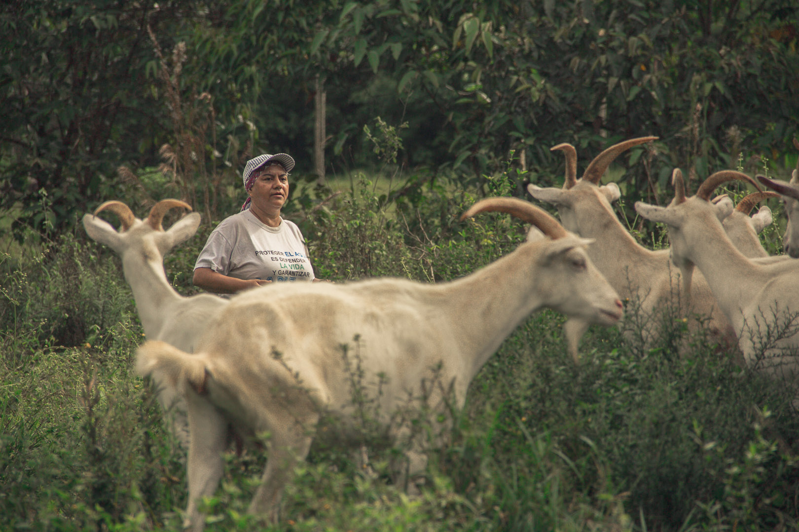 Marlén Arévalo dice que su esposo, su hija y sus cabras son su familia. Insiste constantemente en que ellos le salvaron la vida ayudándola a superar el cáncer. Se convirtió en lideresa ambiental desde que empezó a escuchar que se iba a realizar exploración petrolera cerca del río Humadea. Esta mujer de sonrisa amplia y risa contagiosa dice que ha luchado durante seis años contra la exploración petrolera de la zona, en cabeza de Ecopetrol, para proteger el agua que surte a más de 60 hogares. La vida de su familia y la de sus animales ha estado en riesgo desde el plantón de 2013, que buscaba defender la flora y fauna del Piedemonte Llanero.