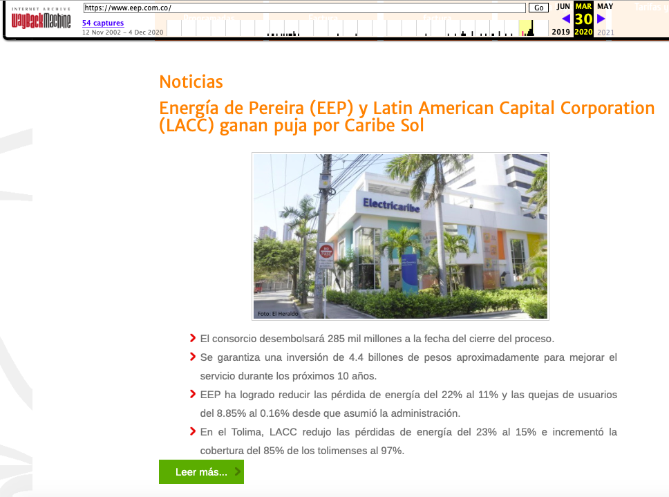 En un debate de control político a la entonces ministra de Energía, María Fernanda Suárez, el 19 de mayo de 2020, el senador del Polo Democrático, Jorge Enrique Robledo, señaló el posible monto que el Consorcio Energía de la Costa, en manos del empresario Alberto Ríos Velilla, habría pagado por el negocio. La denuncia la hace a partir de una publicación hecha en la página de EnerPereira que estuvo disponible por lo menos hasta el 30 de marzo de 2020 (10 días después de realizada la subasta) y que luego eliminaron. Allí informaban que el consorcio había ganado “la puja por Caribe Sol” por “285 mil millones a la fecha del cierre del proceso”. El enlace original puede ser consultado en Internet Archive.