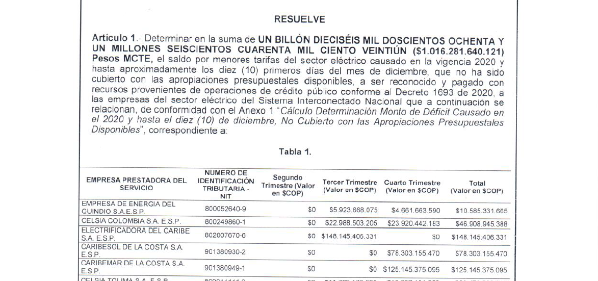 De las 30 empresas, que incluyen las nuevas Afinia (Caribe Mar) y Air-e (Caribe Sol), Electricaribe presenta el mayor déficit con más de 148 mil millones de pesos. Le siguen EPM, con 125 mil millones, y Codensa con 110 mil millones. En total el Ministerio calcula en un billón dieciséis mil millones de pesos el saldo por menores tarifas de energía en 2020.