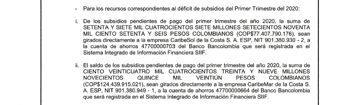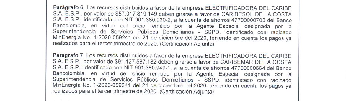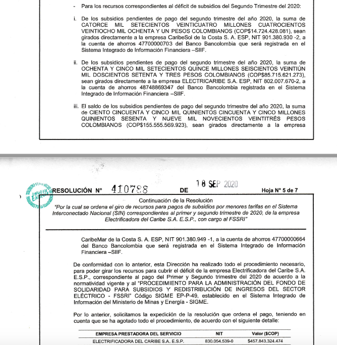 Según la resolución, esos 148 mil millones de pesos no se giran a Electricaribe, sino a Caribe Mar (91.127.587.182) y Caribe Sol (57.017.819.149).