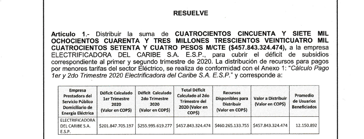 En una resolución anterior, del 18 de septiembre de 2020, el Ministerio de Energía giró a Electricaribe la suma de 457.843 millones por el déficit de subsidios por el primer y segundo trimestre de ese año.