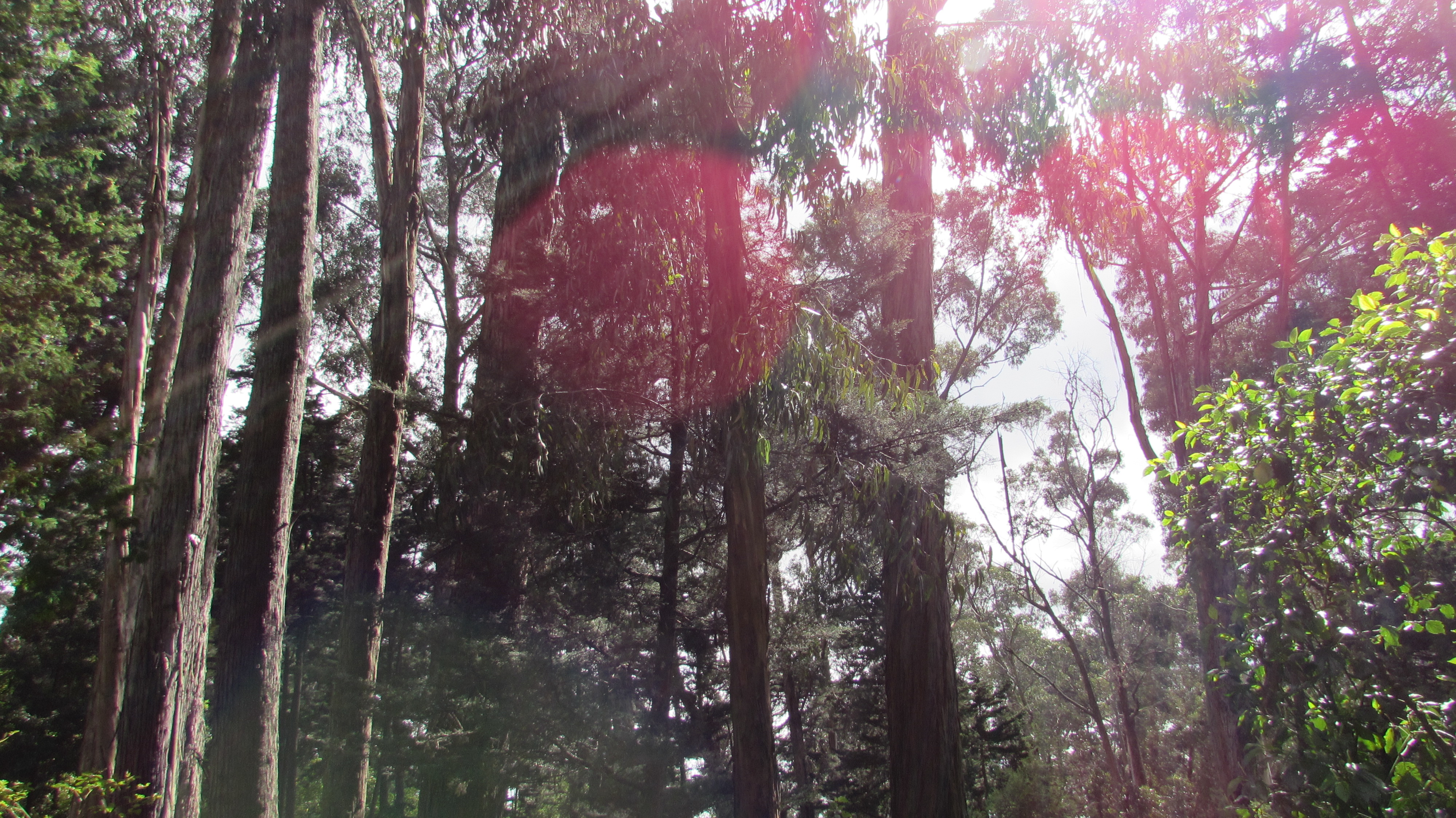 Allí comenzamos a trazar nuestro camino sobre hojas secas y charcos de agua negra, rodeados de prominentes árboles que ocultaban la claridad del cielo tiznado de gris, entre sus ramas enmarañadas. Nuestros pulmones se dejaban invadir por la pureza del ambiente que abandonaba lentamente el aire asfixiante que nublaba los alrededores de la ciudad. Con cada paso que dábamos podíamos sentir los olores del eucalipto y la madera mojada. Mientras subíamos, nos apartábamos del resto de las personas, que en su día domingo daban un paseo familiar por aquel lugar.