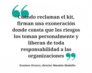 Orozco agregó que fue “un caso fortuito, totalmente salido de la organización, puesto que los atletas o participantes son los que, voluntaria y soberanamente, toman la decisión de participar y en toda la literatura nuestra siempre sacamos tips y recomendaciones para tener en cuenta. Concretamente solicitamos o recomendamos que el participante se haga un examen médico previo al sentir algunas anomalías en su organismo y, cuando reclaman el kit, firman una exoneración donde consta que los riesgos los toman personalmente y liberan de toda responsabilidad a las organizaciones que están preparando el tema”.