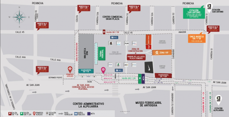 En el instructivo entregado a los corredores, hay un mapa que precisa la ubicación de los puntos de interés en la zona de partida y llegada de todas las categorías. Según ese documento, el personal de primeros auxilios estaba ubicado justo después del cruce de la calle San Juan con la Carrera Cúcuta. Ese lugar está ubicado a aproximadamente 180 metros de la meta.