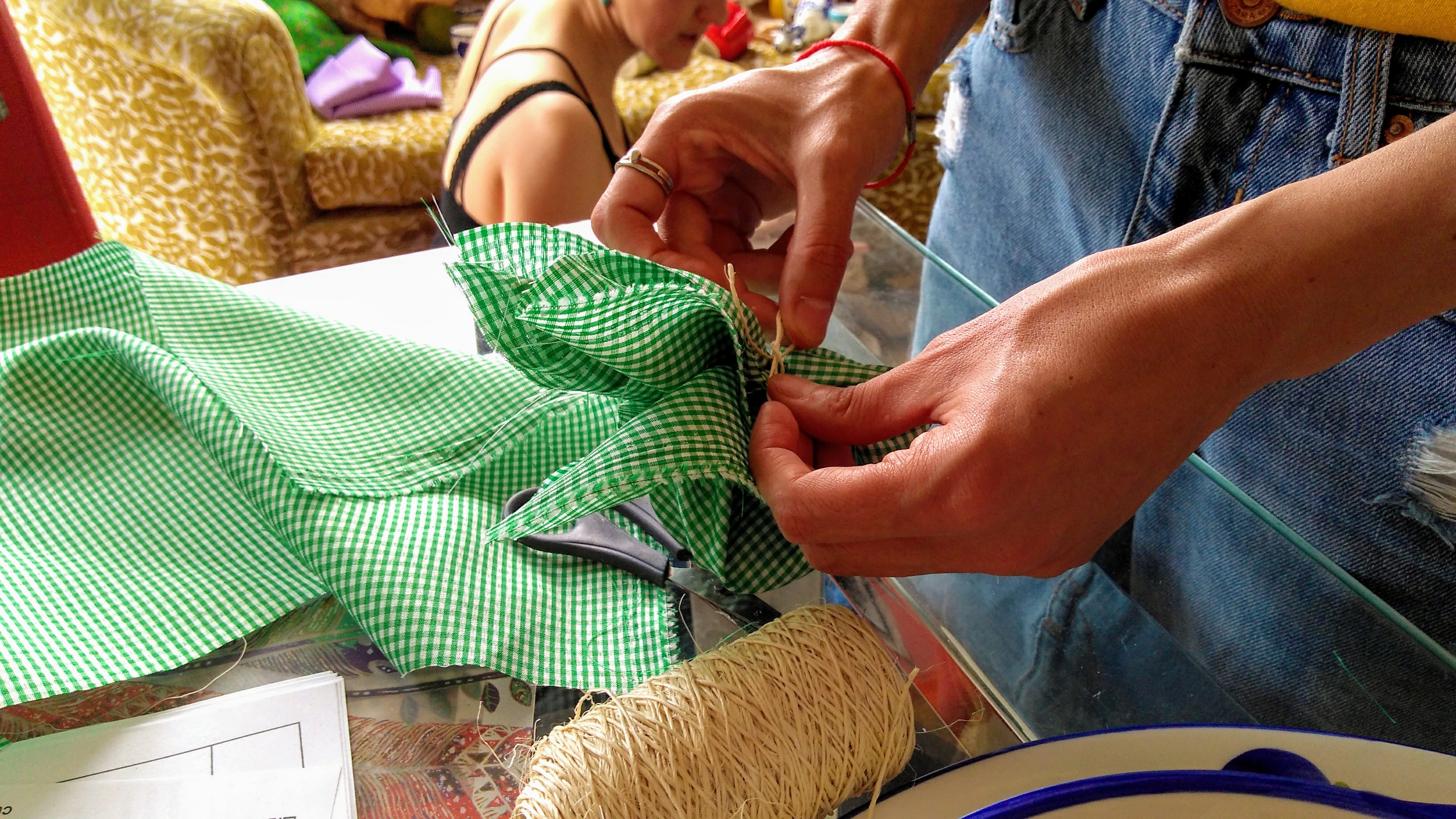 Manos de María Reyes López, envolviendo las piezas quebradas de cerámica para los talleres de Kintsugi.