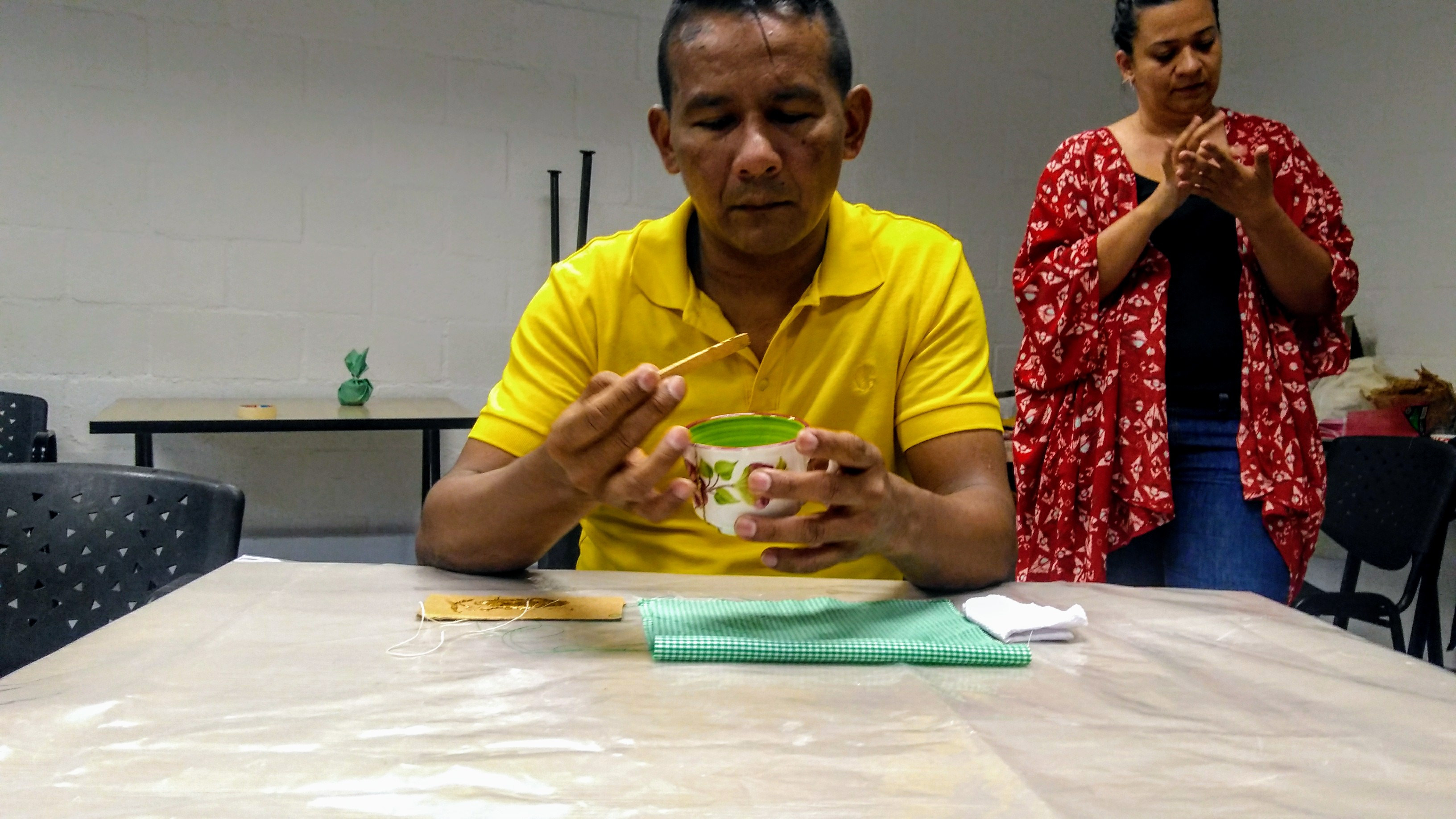 Había otras personas que me conmovieron por toda la valentía y la fuerza que los caracterizaba en esencia, uno de ellos era Sergio, víctima de un testaferro en un combate que lo dejó casi ciego, quien me enseñó que había otras maneras de mirar y sentir con el cuerpo, la pieza que estaba reconstruyendo era un pocillo- cuando me entregaron estas piezas rotas, pude sentir esos cortes profundos con mis manos y me di cuenta que estaba completamente en la ruina, así que le di vida, porque las cosas así pierdan su valor, sé que podemos volver a reconstruirlas-.