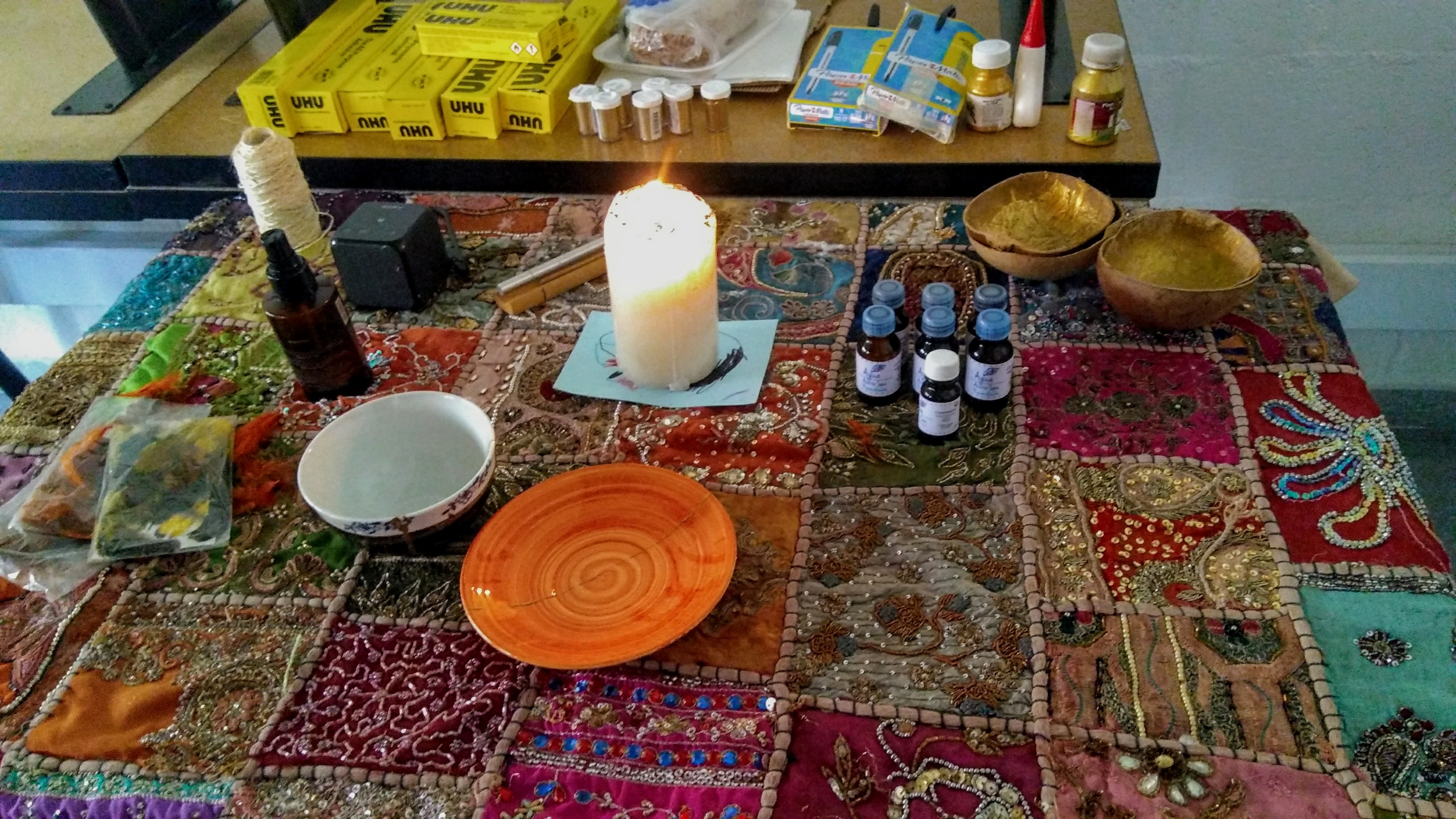 Lo interesante es que hacia el lado derecho del salón, se encontraba lo que se consideraba como “la mesa sagrada”, que era una mesa cubierta con lo que parecía ser un mantel hindú; lleno de lentejuelas, perlas y telas de colores exóticos; en el centro había una vela blanca encendida, unas esencias, un pequeño instrumento de madera que sirve para la meditación y pequeñas cocas con resina dorada en su interior.