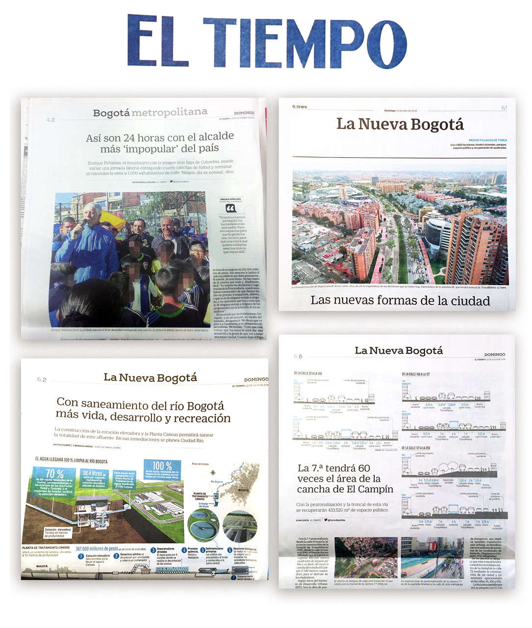 El especial tenía un cabezote que decía, de nuevo, “La Nueva Bogotá”. En seis páginas completas, los lectores podían encontrar un artículo que celebraba el ambicioso proyecto de descontaminación y recuperación del Río Bogotá; otro que elogiaba la reorganización en el modelo de salud; uno más que aplaudía la reducción en la tasa de homicidios; un texto que señalaba el trabajo de la Alcaldía en cientos de parques que hoy permiten “conectarse con la felicidad”; y así, varios más.