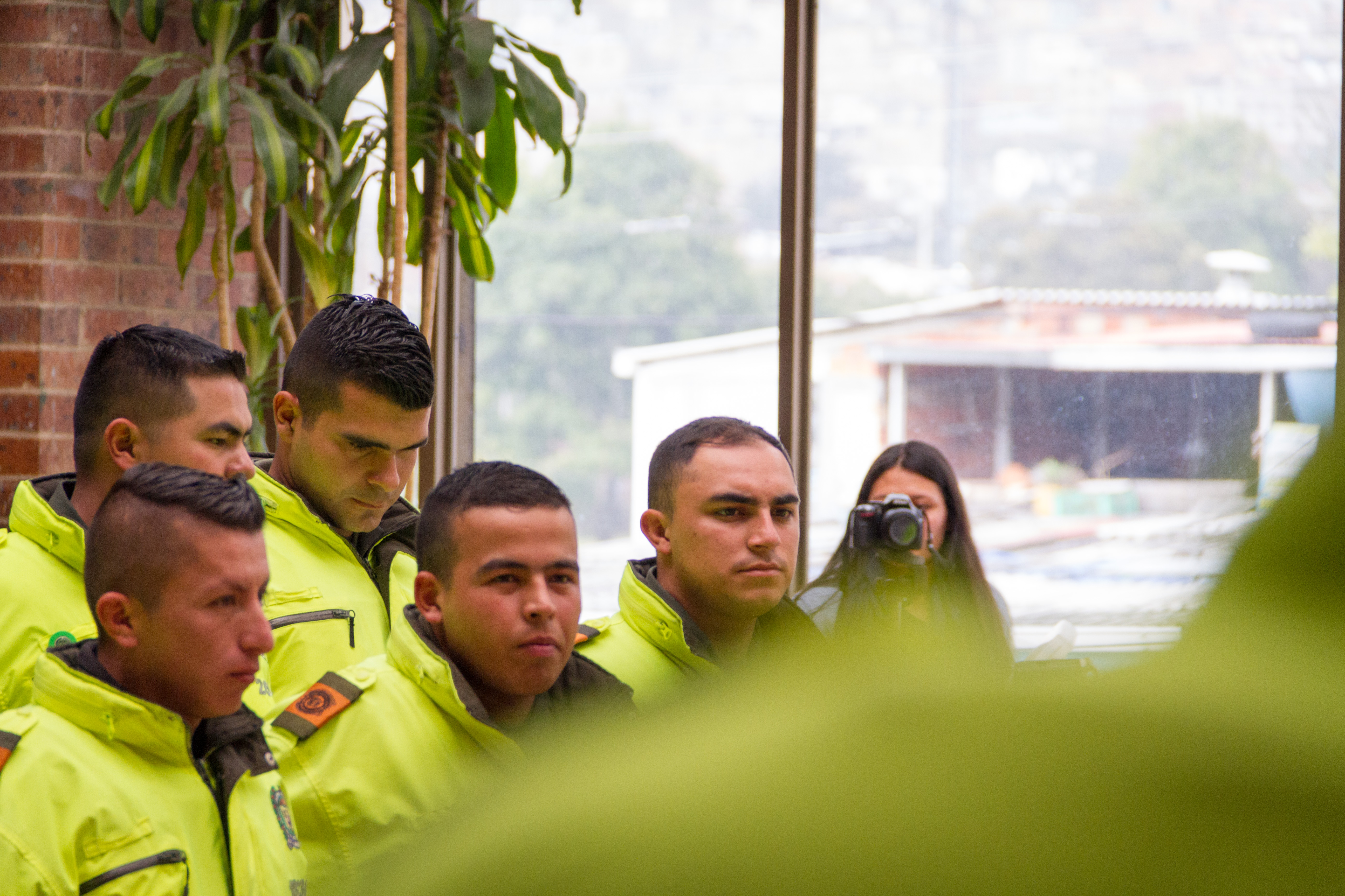 Todos los días, Ánderson llega hasta la estación de policía de San Cristobal y junto con sus compañeros hace la respectiva formación para recibir instrucción de sus comandantes. (Foto: Víctor Cocomá)
