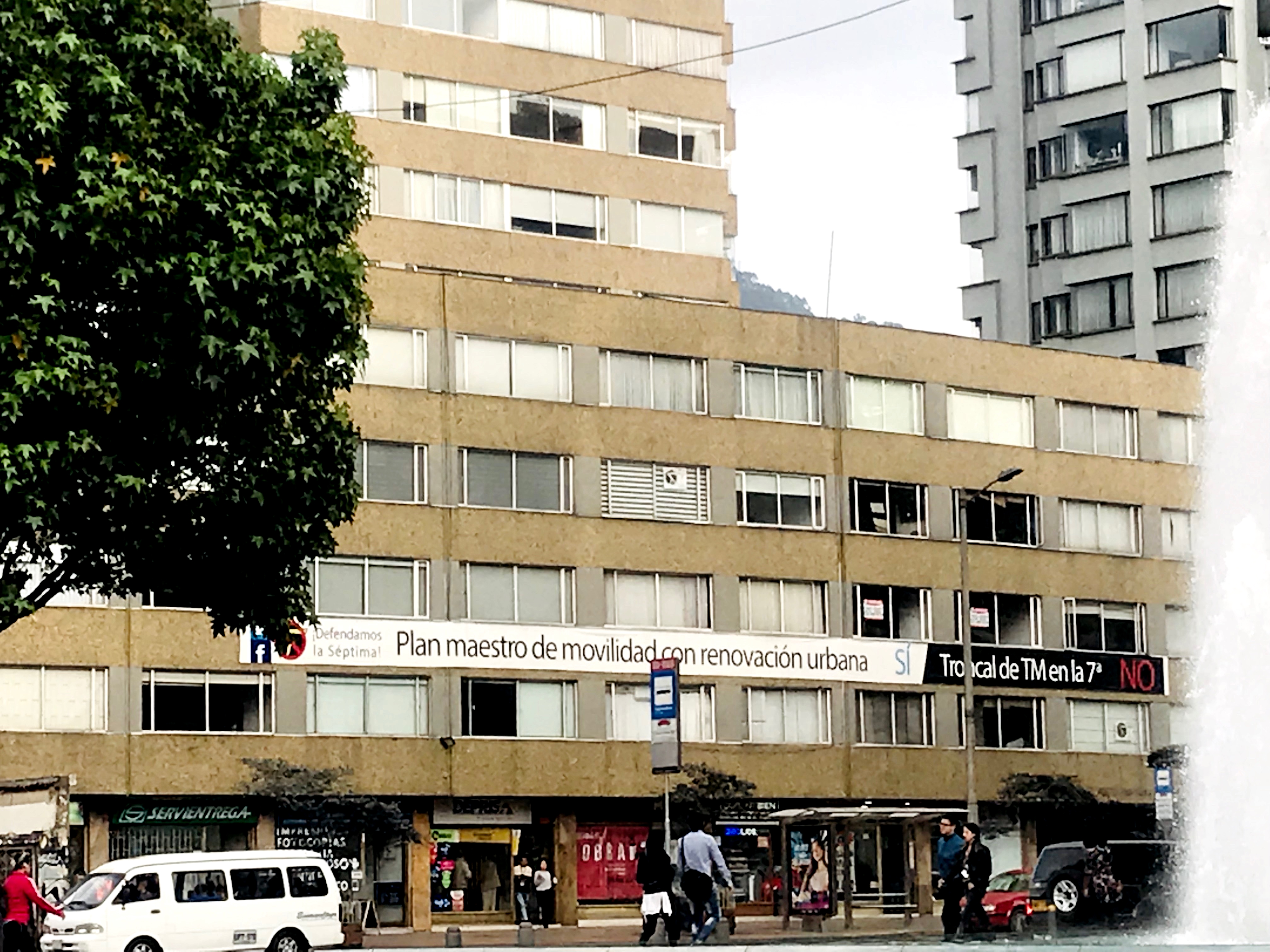 Edificio ubicado sobre la carrera 7° a la altura de la calle 42. Exhibe avisos en contra de la Troncal Séptima. (Foto: Camilo Camacho).